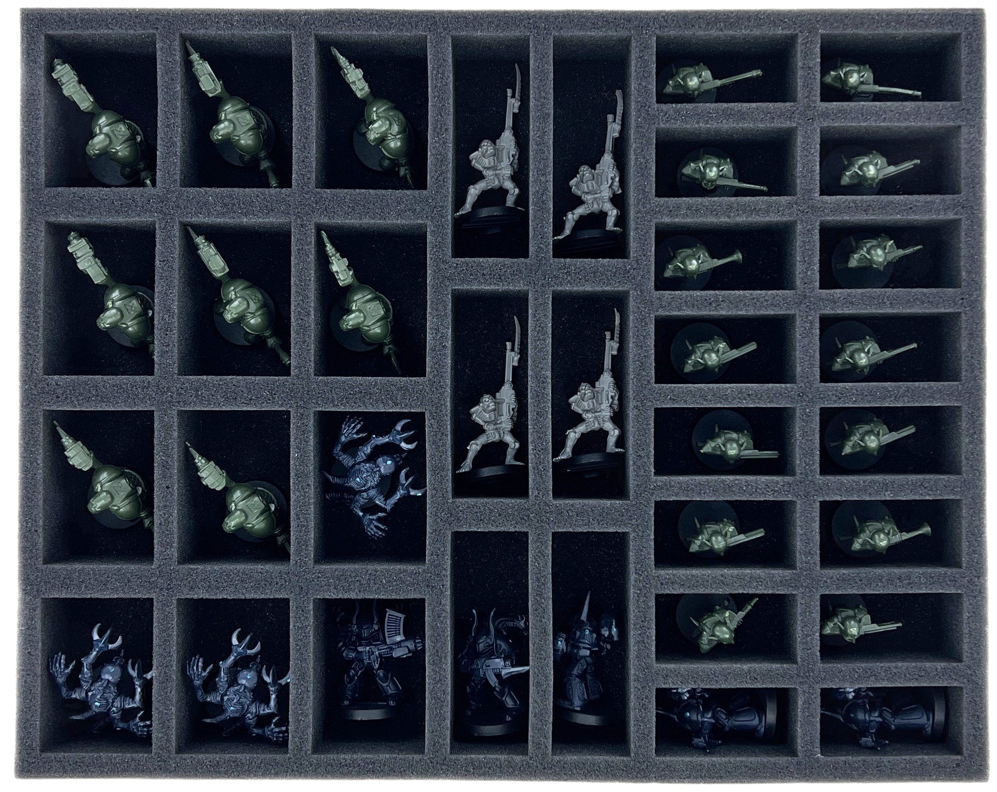 Zum Schutz deiner 72 Miniaturen und zur Sortierung deines Spielmaterials, haben wir 2 Full-Size und 7 Half-Size Schaumstoffeinlagen abgestellt. Ganz egal ob Robotlings, Galaxy Safe Guard oder Eldar, jede Miniatur, erhält ein eigenes maßgeschneidertes Fach. Dank des passgenauen Zuschnitts haben die Miniaturen einen festen Sitz und können auch beim Transport durch den Warp nicht verrutschen. Das schont nicht nur deine Figuren vor Schäden, sondern auch deine Nerven. Abplatzende Farbe verhindert der weiche Schaumstoff genauso zuverlässig wie Kratzer auf deinen bemalten Figuren.