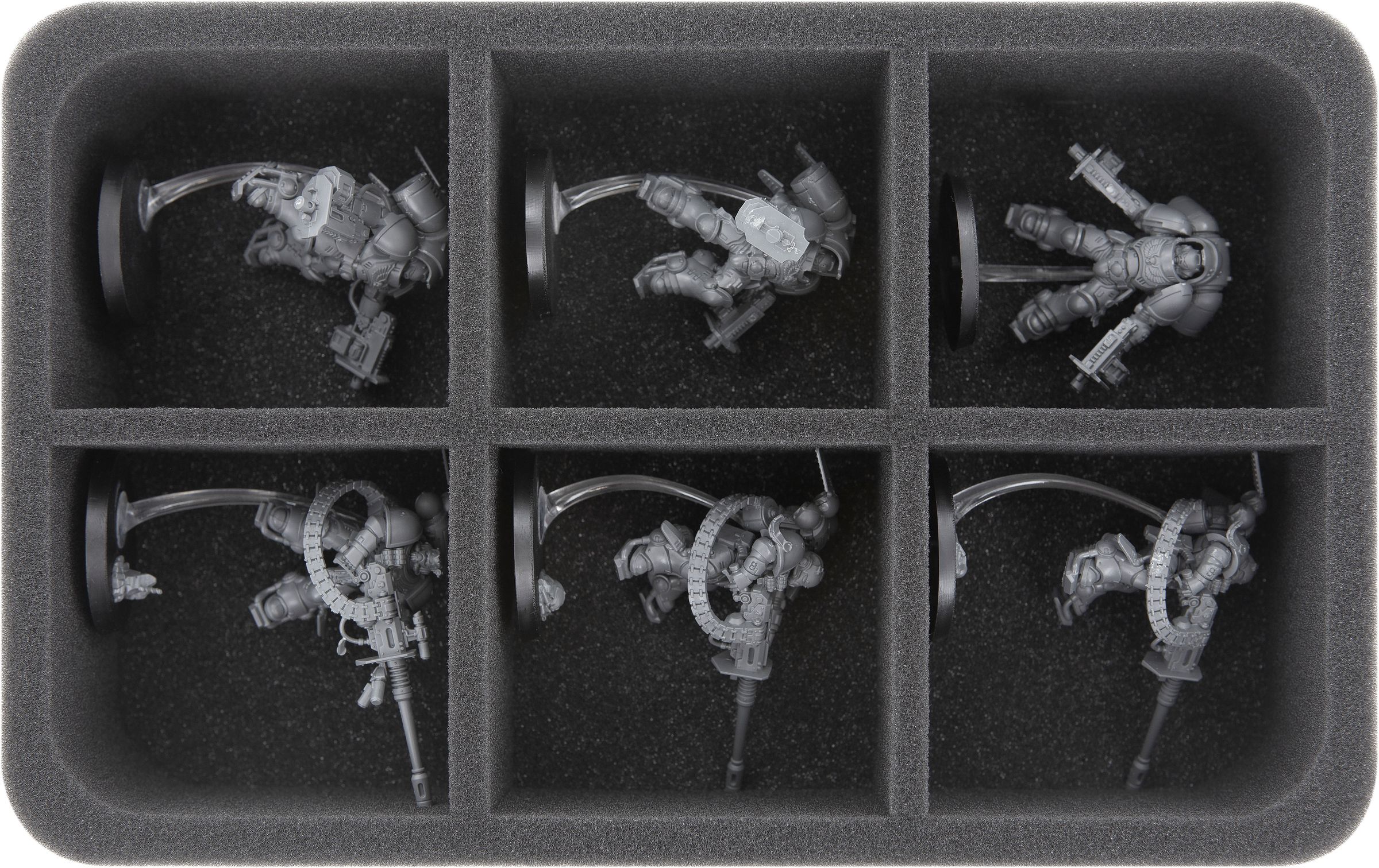 Die Einlage mit 6 großen Fächern bietet Platz für die drei Suppressors. Der weiche Schaumstoff schützt die empfindlichen Teile der feinteiligen Miniaturen optimal vor Beschädigungen. So bleiben die mächtigen Beschleuniger-Maschinenkanonen einsatzbereit und die bruchfreudigen Flugbases intakt.