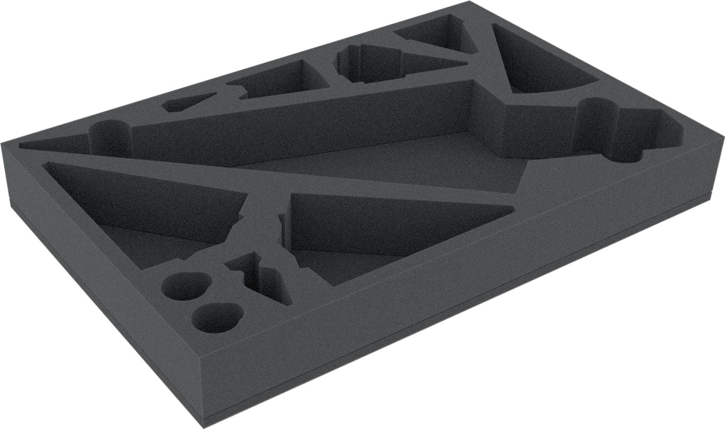 Die Schaumstoffeinlage hat die Abmessungen: 565 mm x 365 mm x 70 mm Gesamthöhe (60 mm Nutzungshöhe + 10 mm Boden).