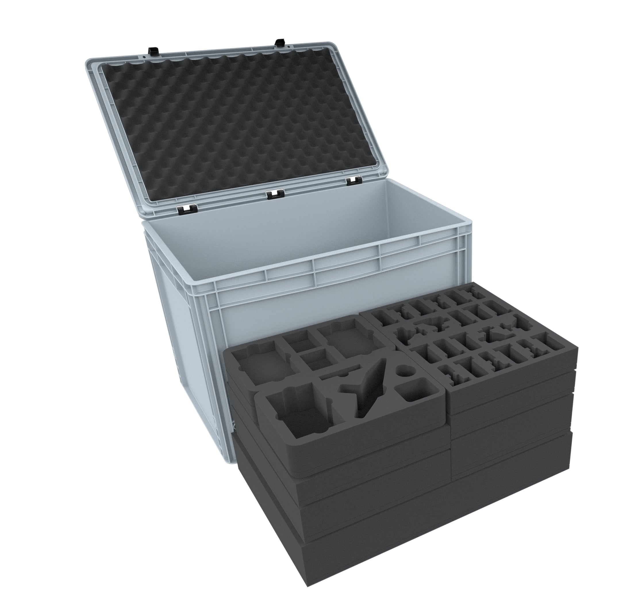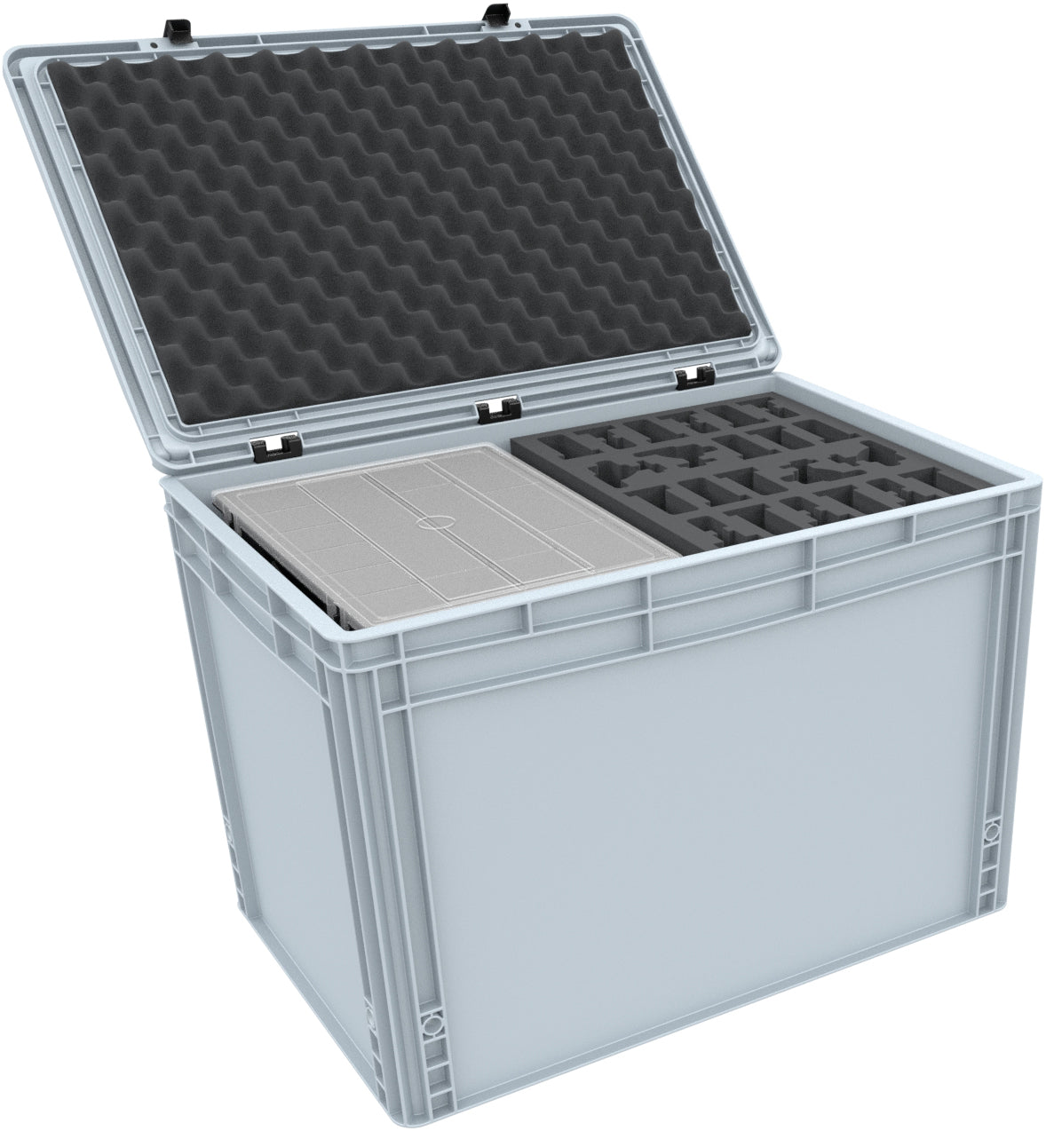 Natürlich passen die Schaumstoffeinlagen exakt in den kompakten Eurobehälter mit Scharnierdeckel von Auer Packaging. Der Eurobehälter lässt sich aufgrund des einfach zu bedienenden Scharniersystems im Handumdrehen verschließen. Deine Spielmaterialien sind somit optimal vor Transportschäden geschützt.