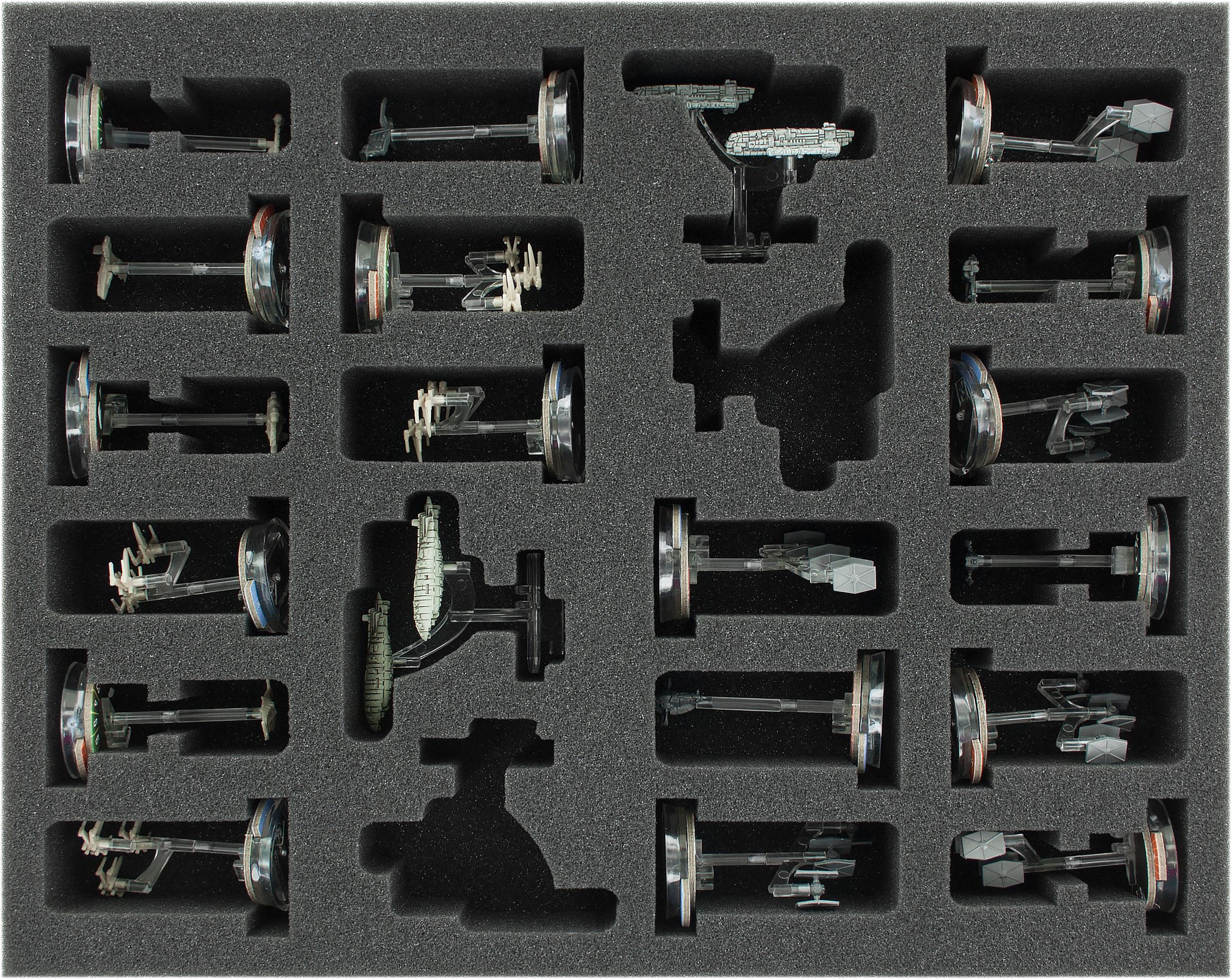 • 1 Schaumstoffeinlage mit 12 Fächern für 2 MC80-Sternenkreuzer und/oder MC80-Heimat Eins-Angriffskreuzer, 1 Nebulon-B-Eskortfregatte, 1 Nebulon-B-Unterstützungsfregatte, 1 Phönixnest, 1 MC30c-Torpedofregatte oder - Aufklärungsfregatte, 2 Hammerhai-Korvetten, Basen, Schub- sowie Kommandoräder (FSKS045BO)