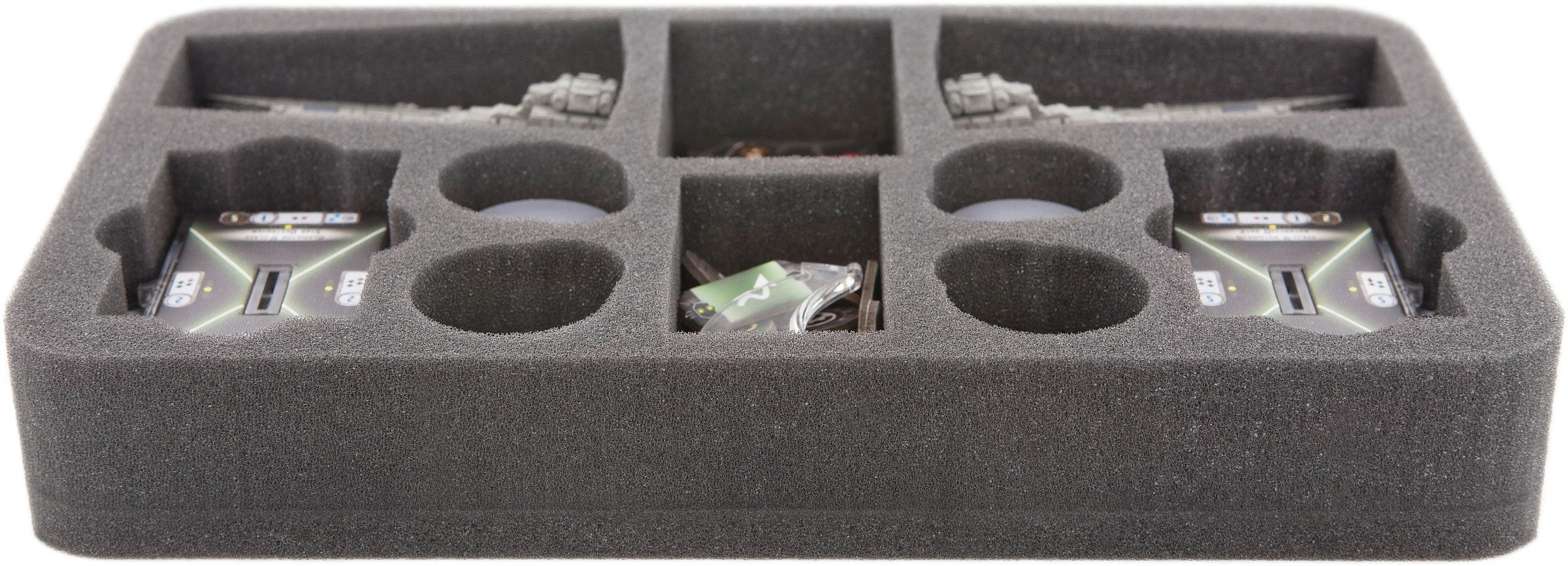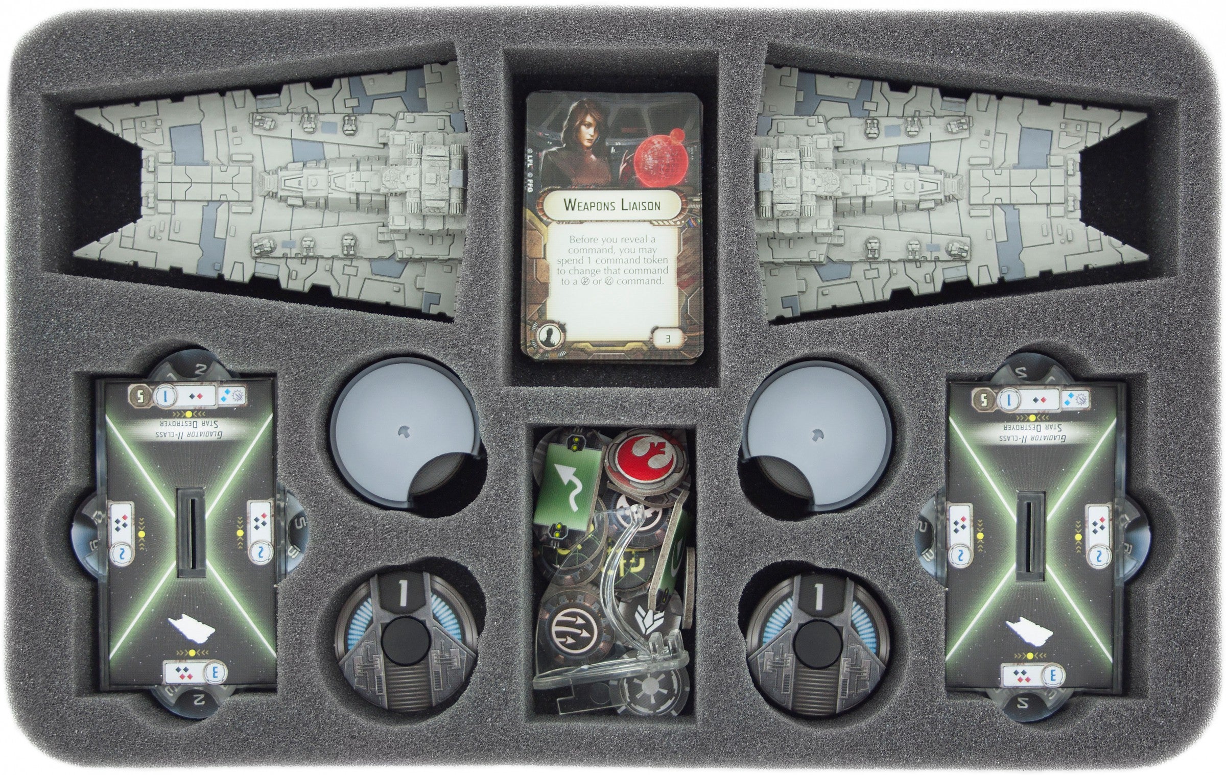 Speziell für den Star Wars Armada Sternenzerstörer der Gladiator-Klasse (Gladiator-Class Star Destroyer) gefertigte Schaumstoffeinlage für perfekten Schutz. Die Matte ist für zwei Sternenzerstörer der Gladiator-Klasse plus Bases konzipiert. Sechs kleinere Fächer für Karten, Token oder Zubehör komplettieren die Schaumstoffeinlage.