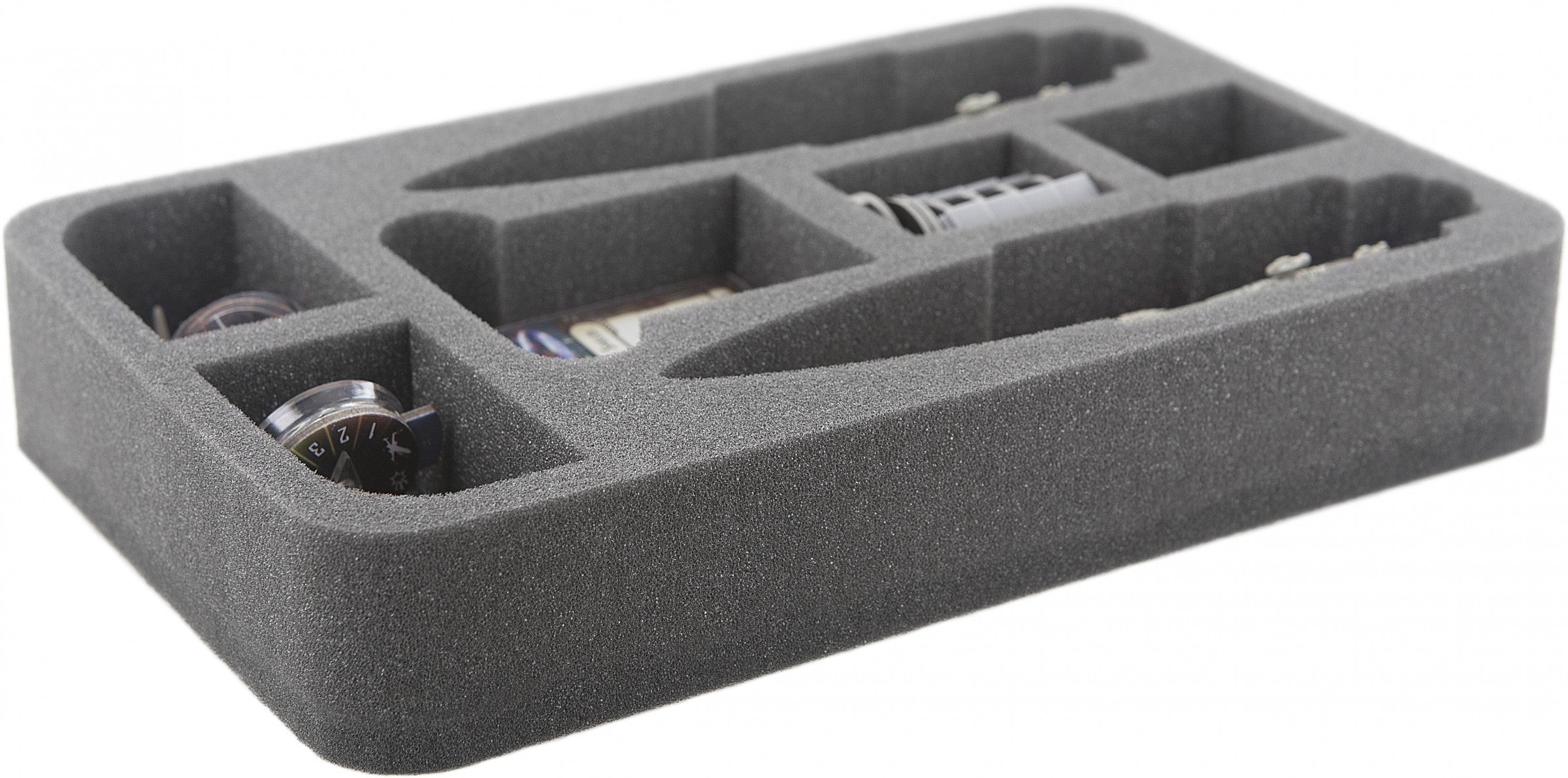 Speziell für Star Wars Armada Wave 2 gefertigte Schaumstoffeinlage für perfekten Schutz. Die Matte ist für 2 Heimat Eins (Home One) , 2 Rebellen-Staffeln plus Bases konzipiert. Abgerundet wird die Matte durch genügend Platz für Karten in Hüllen und die Kommando- und Schubräder.