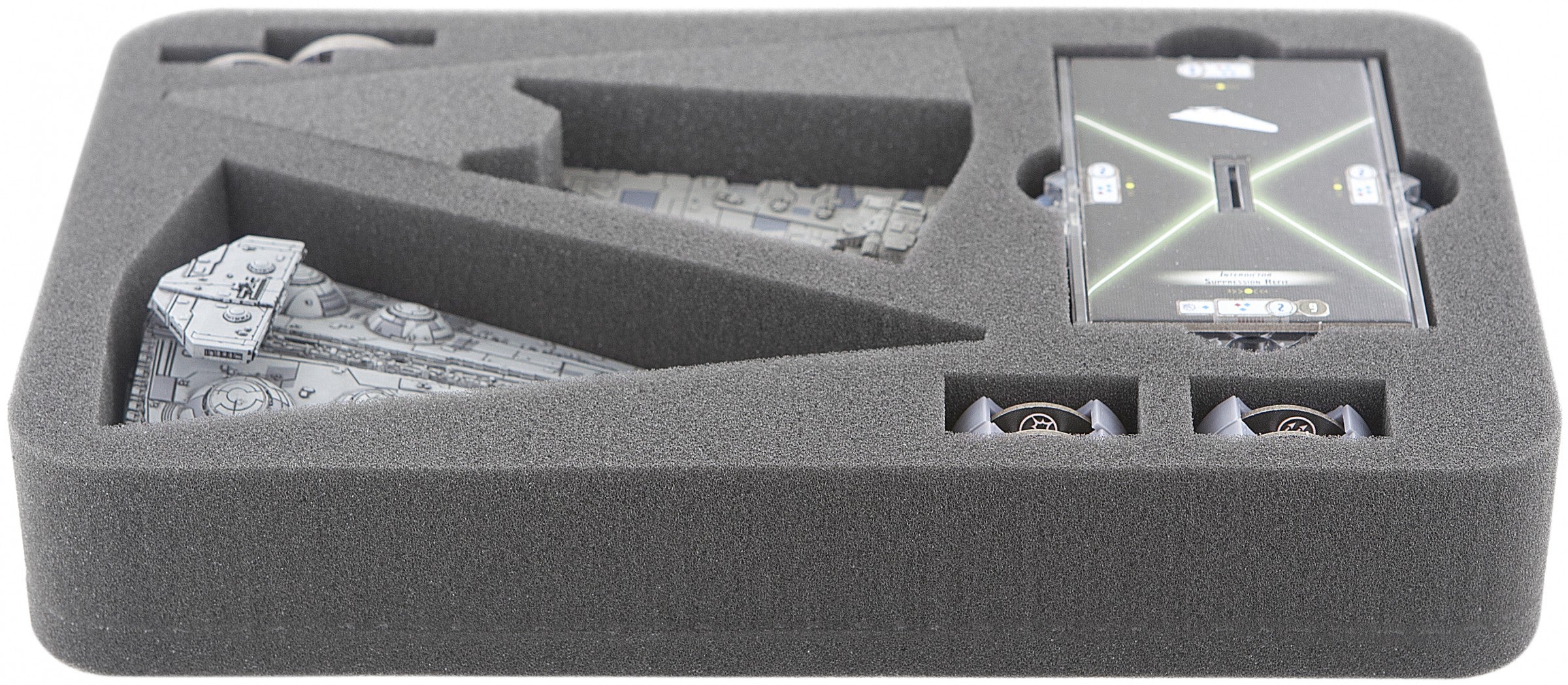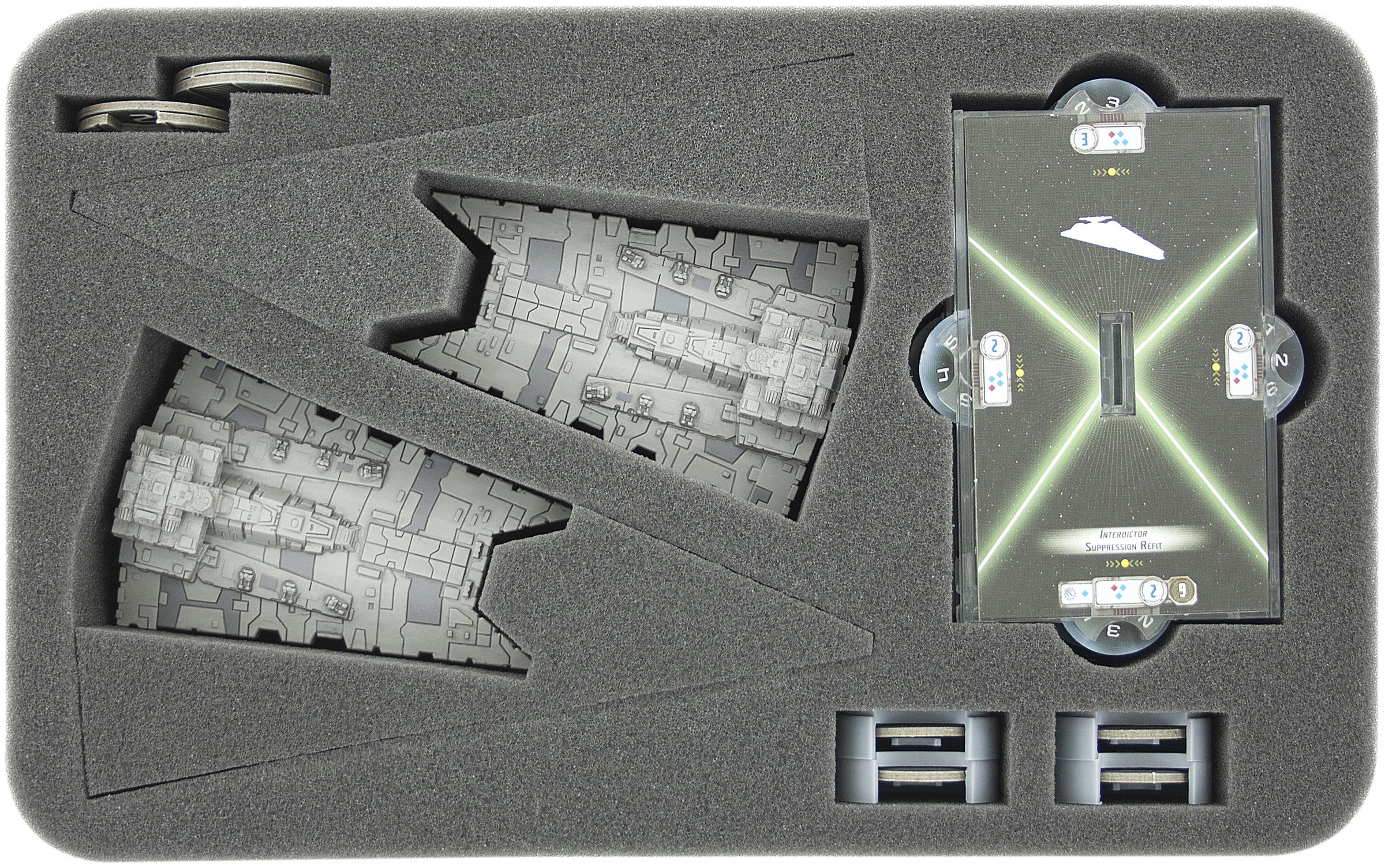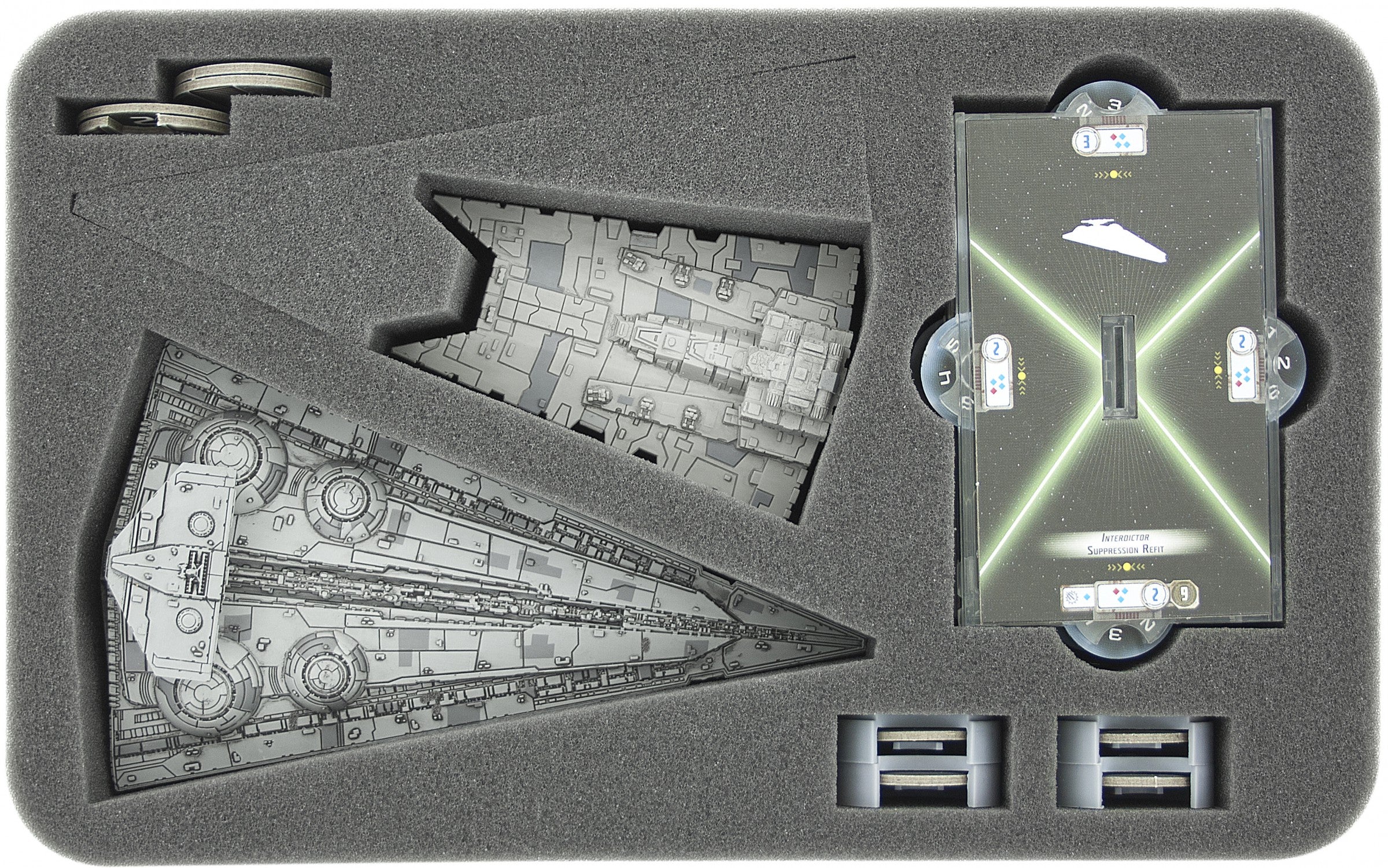 Feldherr Half-Size Schaumstoffeinlage speziell entworfen für Star Wars Armada Wave 4. Die Matte ist für 2 Interdictor plus Bases konzipiert. Ebenfalls im Set enthalten sind zwei Schaumstoffeinsätze, mit Hilfe derer zwei Sternzerstörer der Gladiator-Klasse statt der Interdictor sicher aufbewahrt werden können.