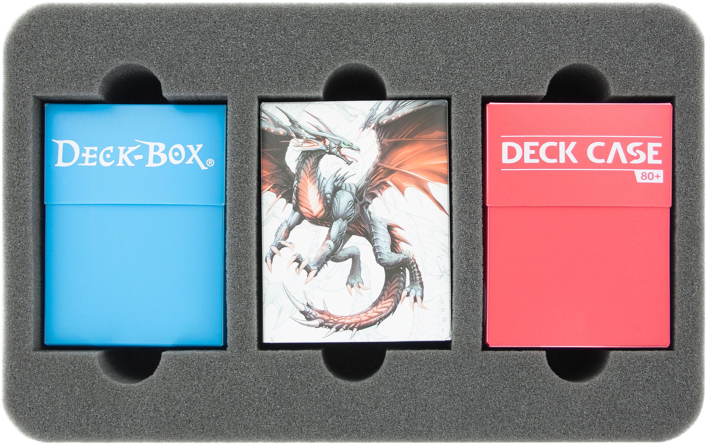 Die Einlage für die Deckboxen ist unterteilt in 3 Fächer. In jedes Fach passt eine Standard-Deckbox (z. B. von Ultra Pro, Ultimate Guard). Möchtest du die Karten direkt ohne Box in der Einlage aufbewahren, hast du Platz für ca. 100 Karten mit Sleeve und ca. 200 Karten ohne Sleeve.