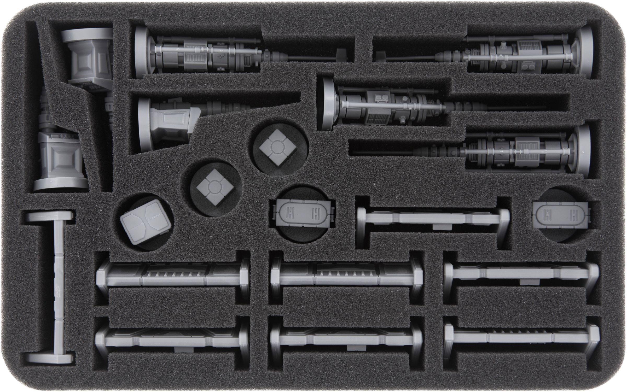 Umgeben von hochwertigem Schaumstoff sind deine Modelle bestmöglich geschützt. Gerade filigrane Teile wie z. B. Kanonen und Antennen werden in maßgeschneiderten Fächern zuverlässig vor dem Abknicken bewahrt. Natürlich bietet der samtige Schaumstoff auch Schutz vor Beschädigungen der Oberfläche – wenn du deine Miniaturen also bemalt hast, kannst du sicher sein, dass deine kleinen Kunstwerke erhalten bleiben.