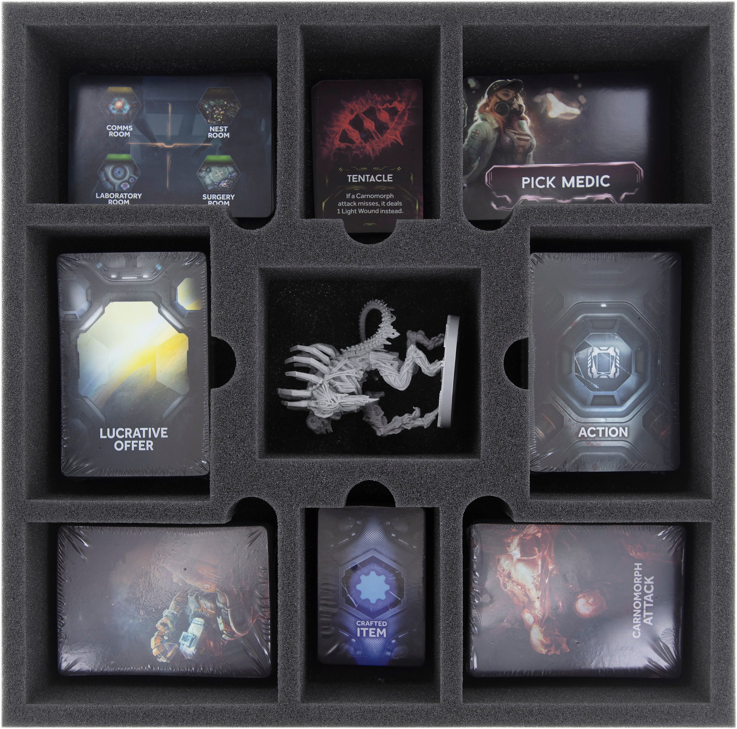 Die Feldherr Schaumstoffeinlage verfügt über 9 Fächer, in denen du Spielkarten und anderes Brettspielzubehör wie Token und Tiles unterschiedlicher Größe sicher und ordentlich aufbewahren kannst. Der feinporige Schaumstoff bietet bestmöglichen Schutz vor Beschädigung – Empfindliche Teile bleiben unversehrt, bemalte Miniaturen bleiben verschont von Abrieb, Kratzen und abgeplatzten Farben.