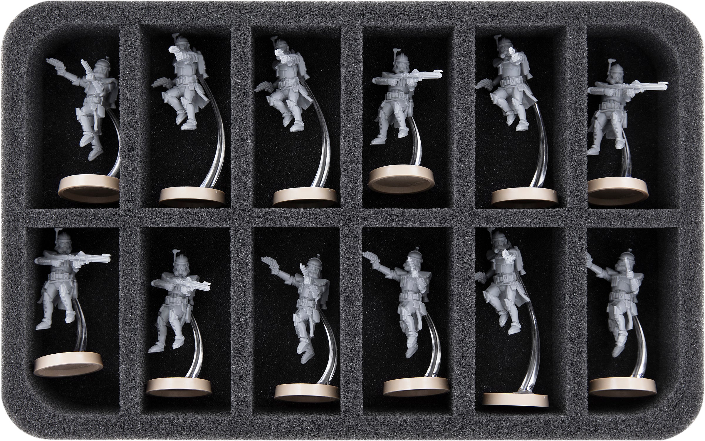Auf dieser Feldherr Schaumstoffeinlage hast du Platz für bis zu 12 Miniaturen deiner Armee. Das Insert eignet sich zum Beispiel besonders gut zum Aufbewahren der ARC Truppler mit Jetpack und Modellen mit ähnlichen Abmessungen.