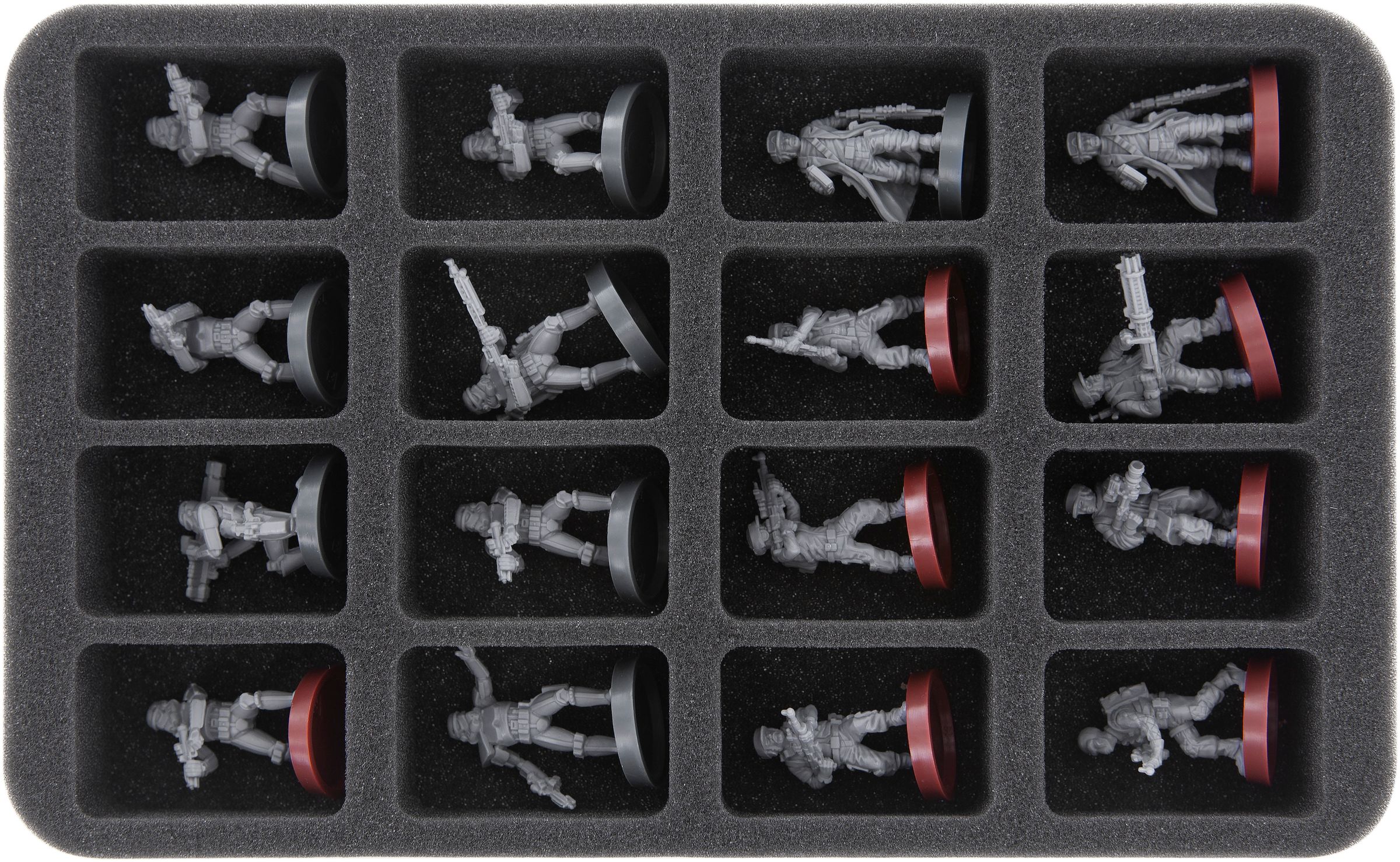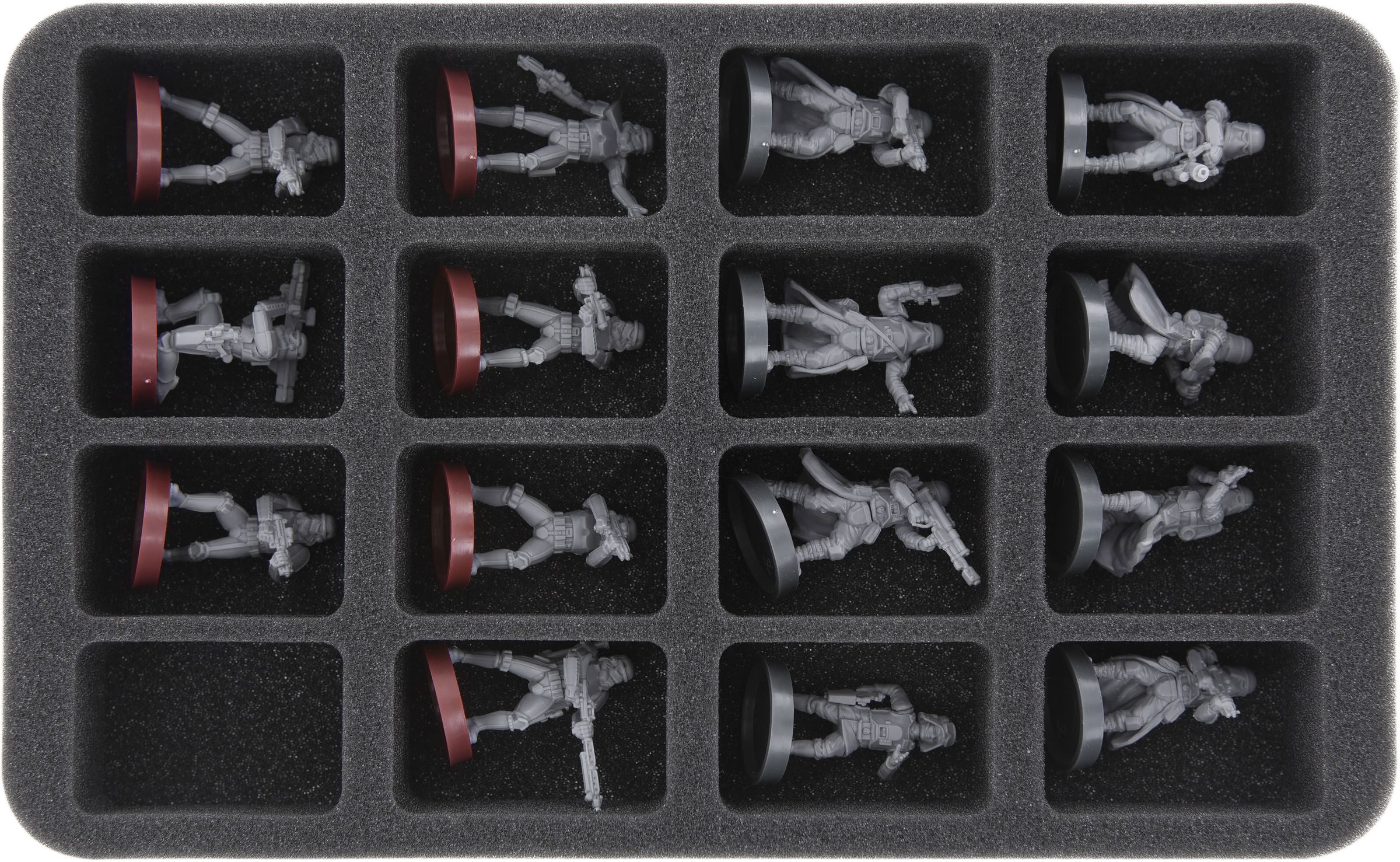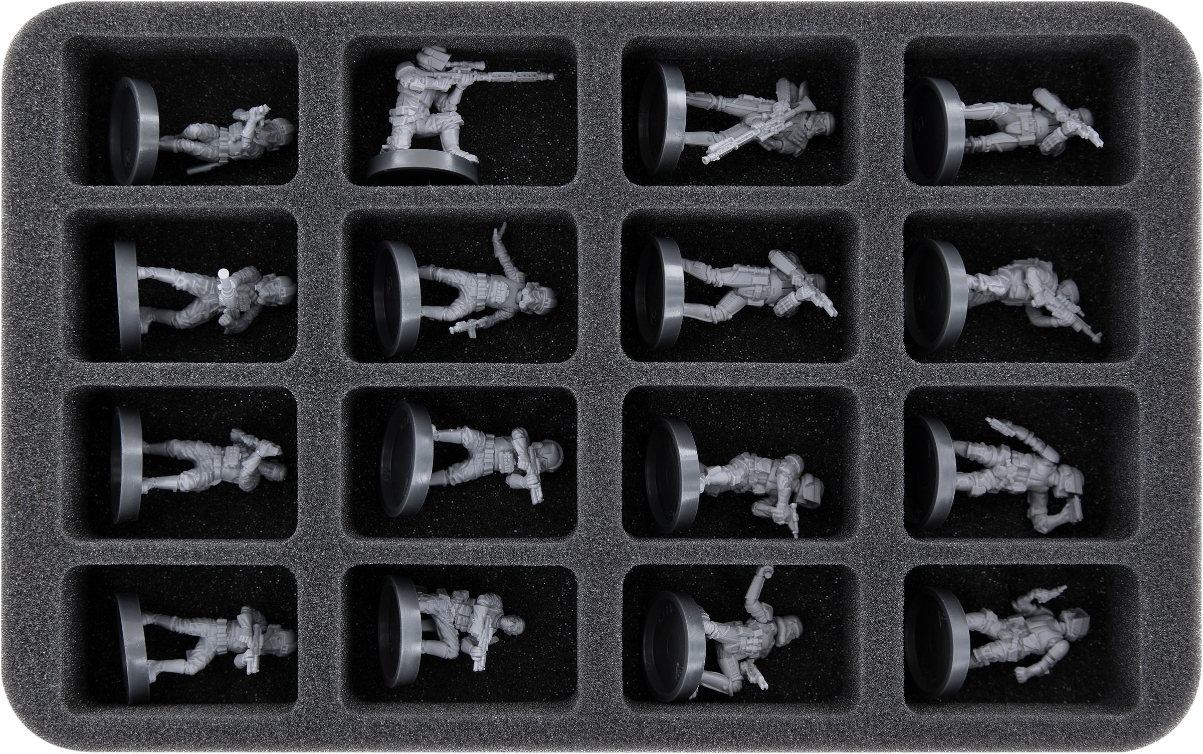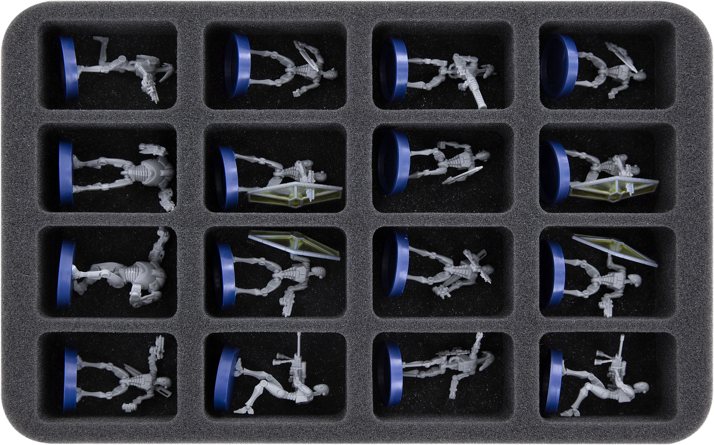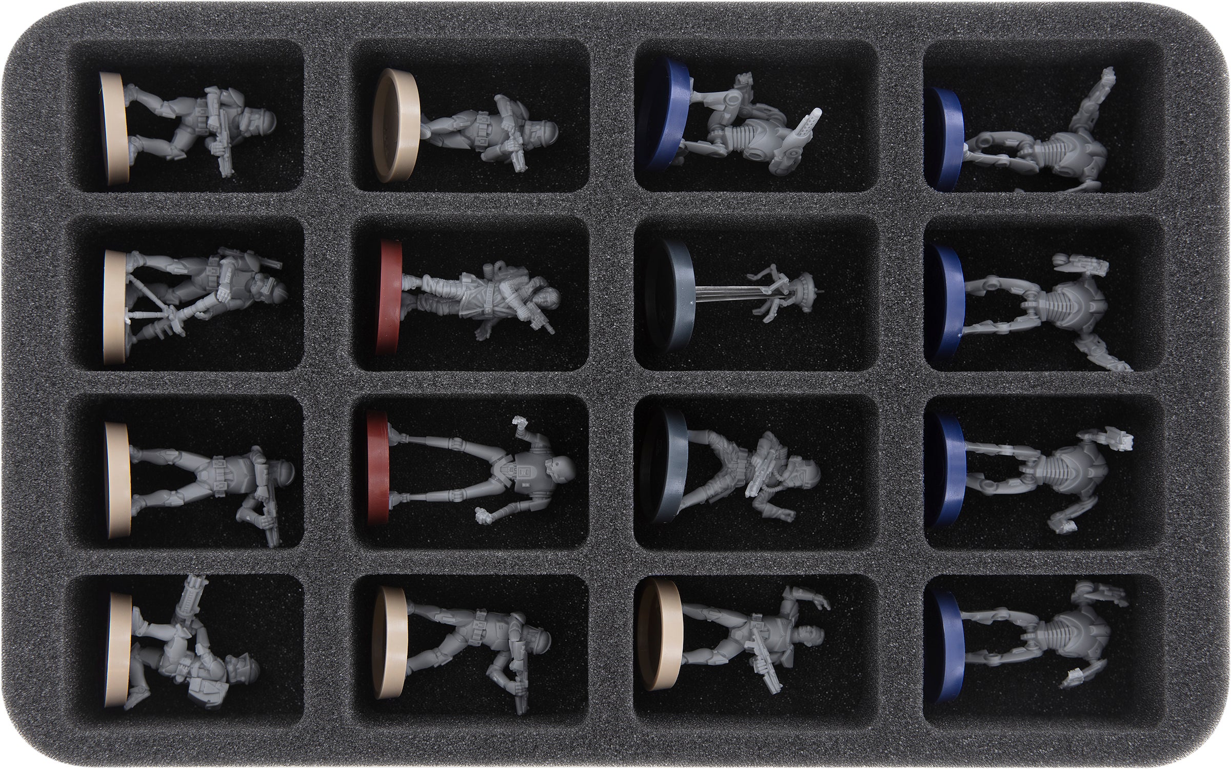 In den insgesamt 16 Fächern unserer Half-Size-Einlage für Star Wars: Legion können bis zu 16 Miniaturen untergebracht werden. Soldaten mit einer bis zu 35 mm breiten Base finden hier liegend Platz. So kannst du deine Figuren im Ganzen betrachten, ohne sie herausnehmen zu müssen.