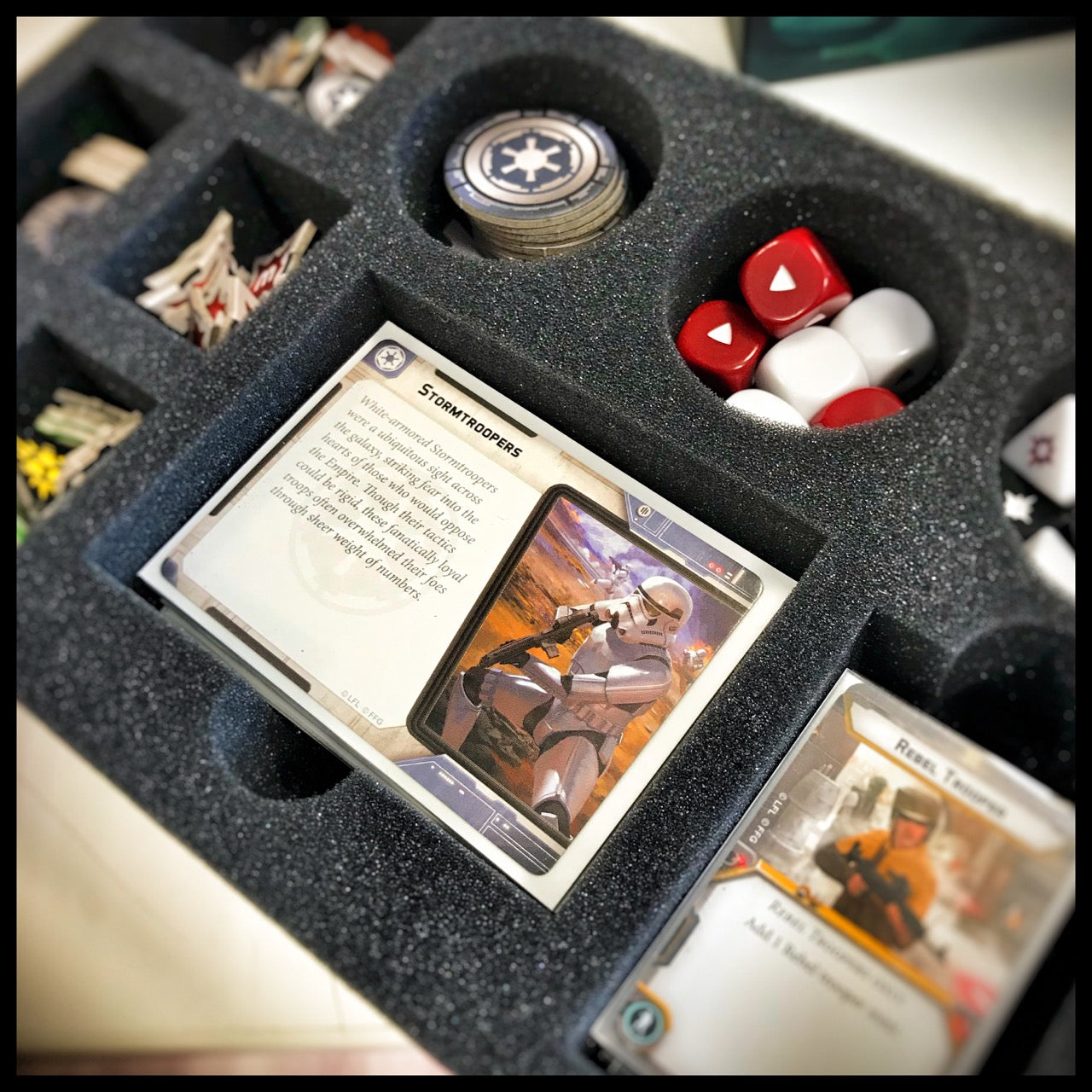 Truppler, Gleiter und Düsenschlitten allein machen noch keine Schlacht auf den Feldern des Galaktischen Bürgerkriegs aus. Ohne Einheiten-, Kommando- und Gefechtskarten lässt sich genauso wenig eine Schlacht bestreiten, wie ohne Token oder Würfel. Damit diese gut sortiert und sauber aufbewahrt werden können, haben wir natürlich auch dafür die passende Einlage parat.
