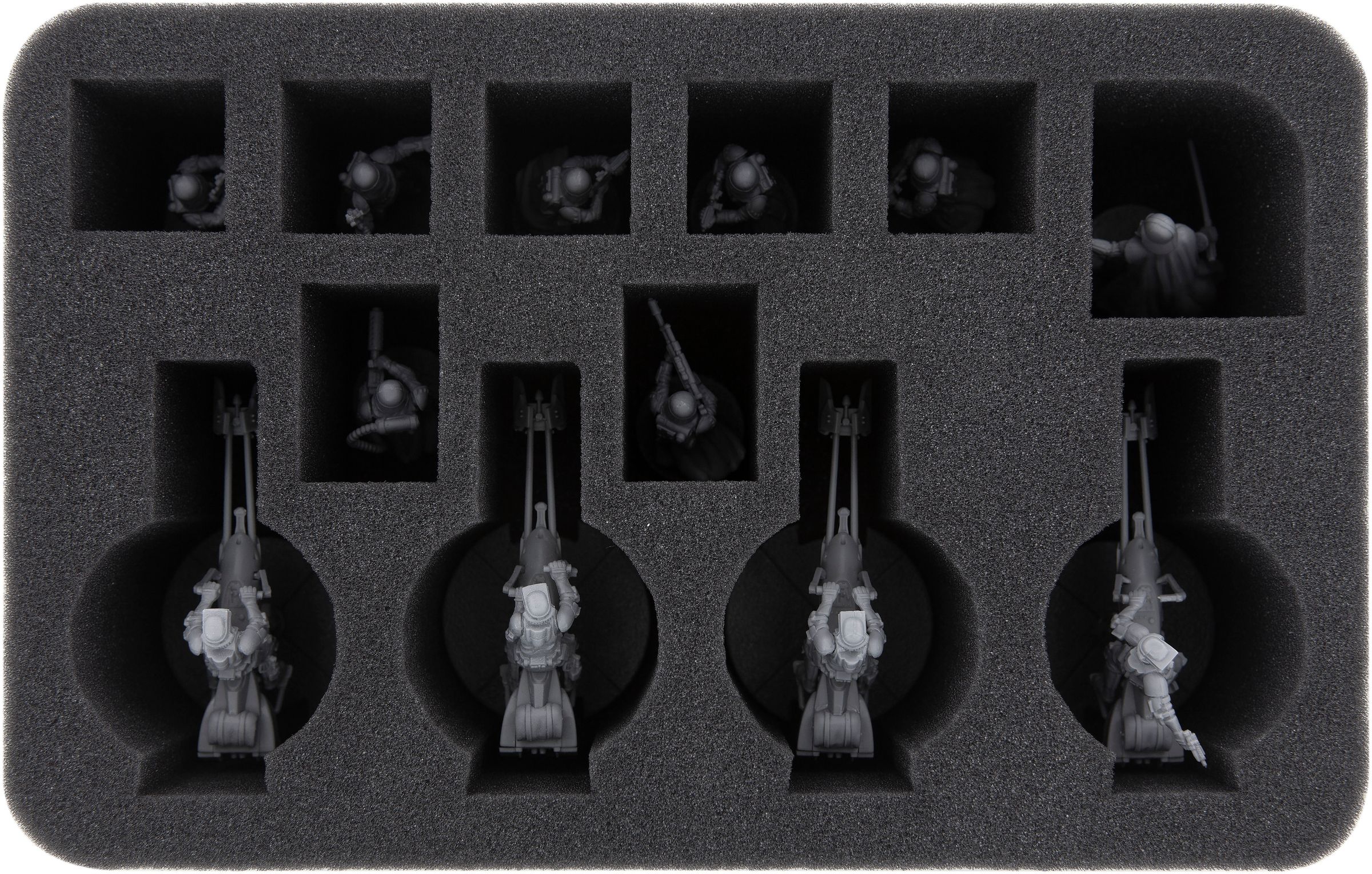 Die Half-Size-Schaumstoffeinlage sorgt dafür, dass vier 74-Z Düsenschlitten sicher verstaut werden können. Dadurch sind sie gut geschützt gegen jegliche Außeneinwirkungen beim Transport zum nächsten Schlachtfeld. Es kann also nichts abknicken und die Farben deiner Figuren bleiben erhalten.