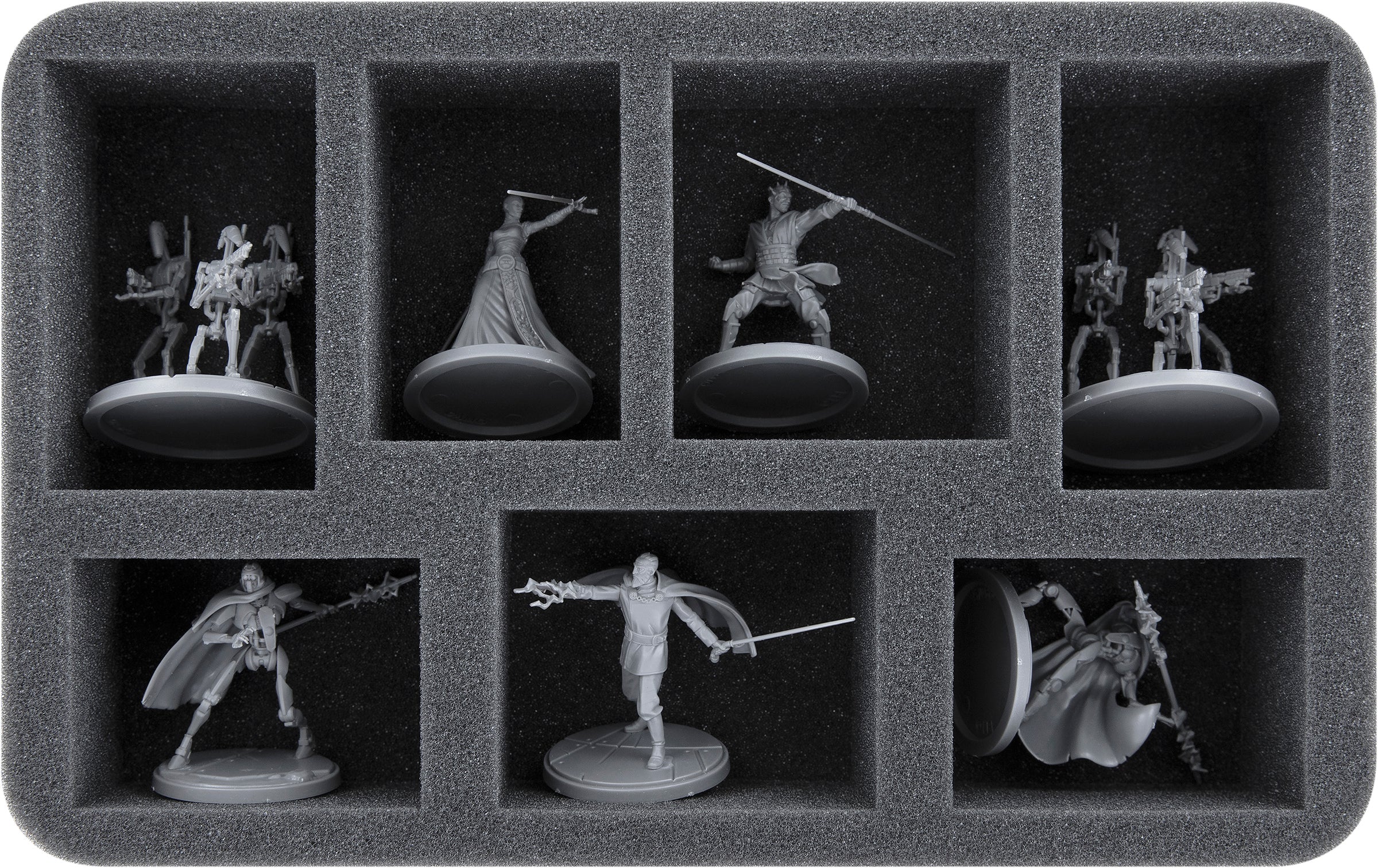 - 1 Half-Size Schaumstoffeinlage für ausladende Modelle auf 40 und 50 mm Bases wie Count Dooku, Asajj Ventress, Kampfdroiden und Miniaturen mit ähnlichen Abmessungen (HSLZ060BO)