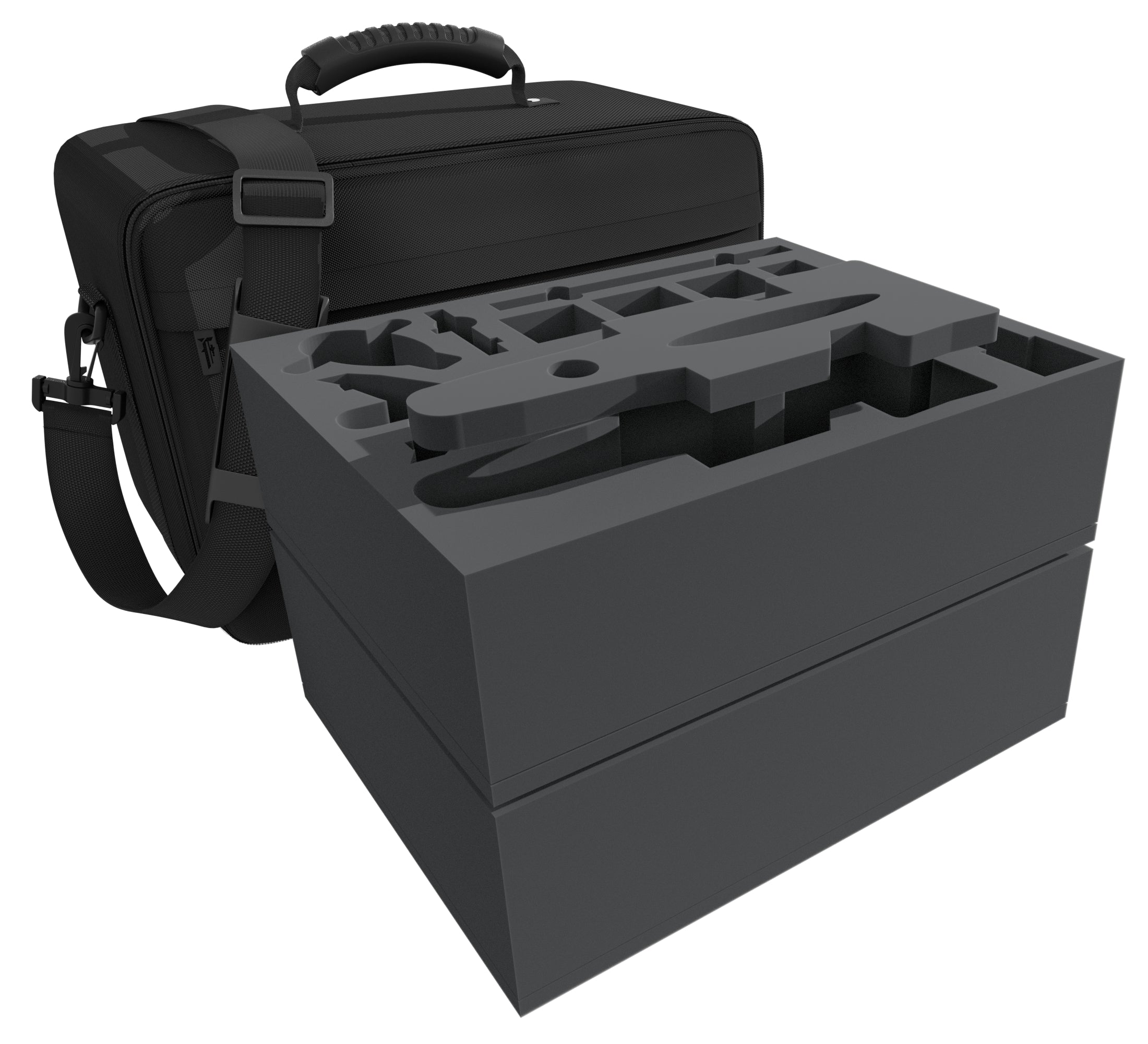 Natürlich passen die Einlagen exakt in die stabile MAXI PLUS-Tasche. Diese besteht aus besonders strapazierfähigem Material. Gepolsterte Seitenteile und ein verstärkter Boden sorgen zusätzlich dafür, dass deine Modelle auch beim Transport mit Auto oder Bahn bestens vor äußeren Einflüssen geschützt sind. Neben dem großen Hauptfach verfügt die Tasche über ein kleines Fach mit Reißverschluss an der Vorderseite. Auf der Oberseite befindet sich ein gummierter, handlicher Tragegriff. Wer die Hände lieber freihat, kann die Tasche dank des verschleißfesten, abnehmbaren Schultergurts auch bequem als Umhängetasche nutzen.