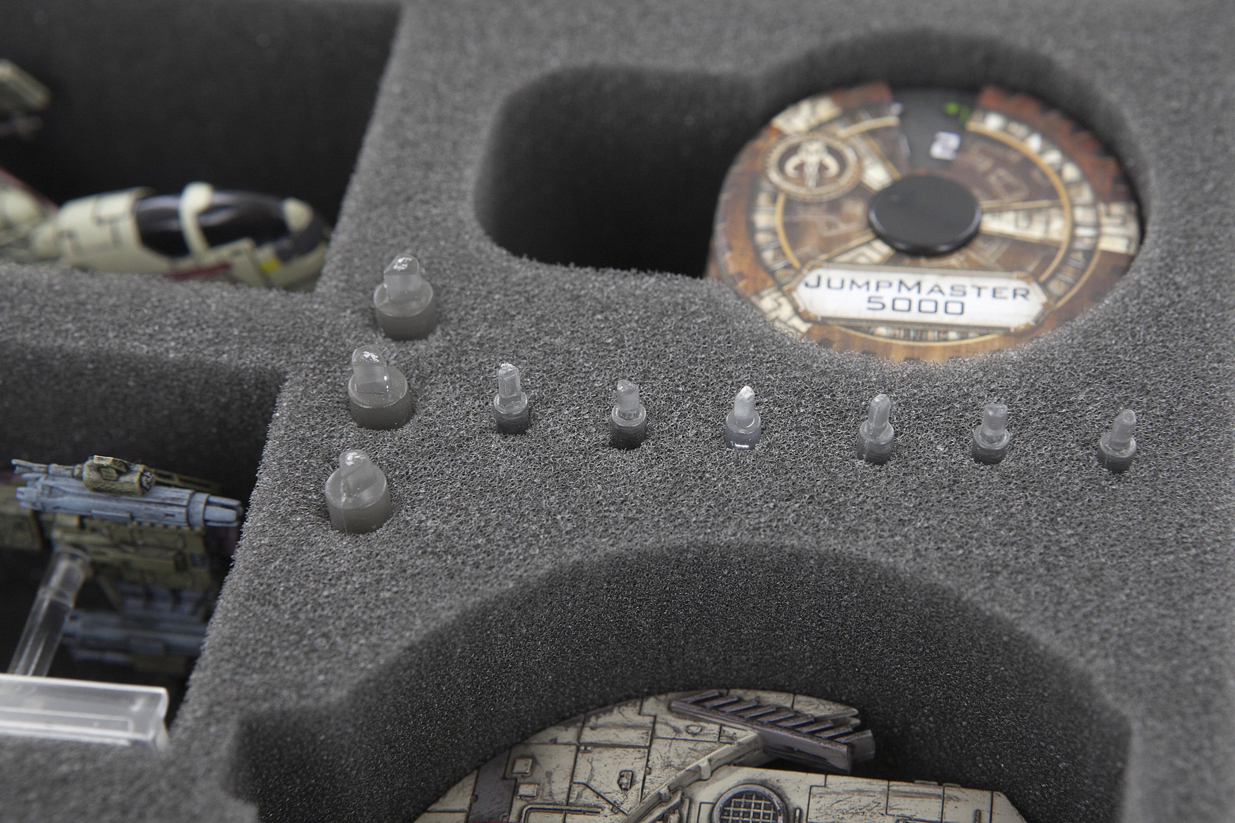 Speziell für einen Star Wars X-Wing JumpMaster 5000 geschnittene Schaumstoffeinlage. In dieser Einlage findet eine Vollstrecker Eins sicher Platz. Zusätzlich passen noch bis zu fünf Jäger in die Einlage. Natürlich bietet die Schaumstoffmatte auch noch Platz für Zubehör. Die Bese-Ständer können in dafür vorgesehene Kreuzschlitze versenkt werden.