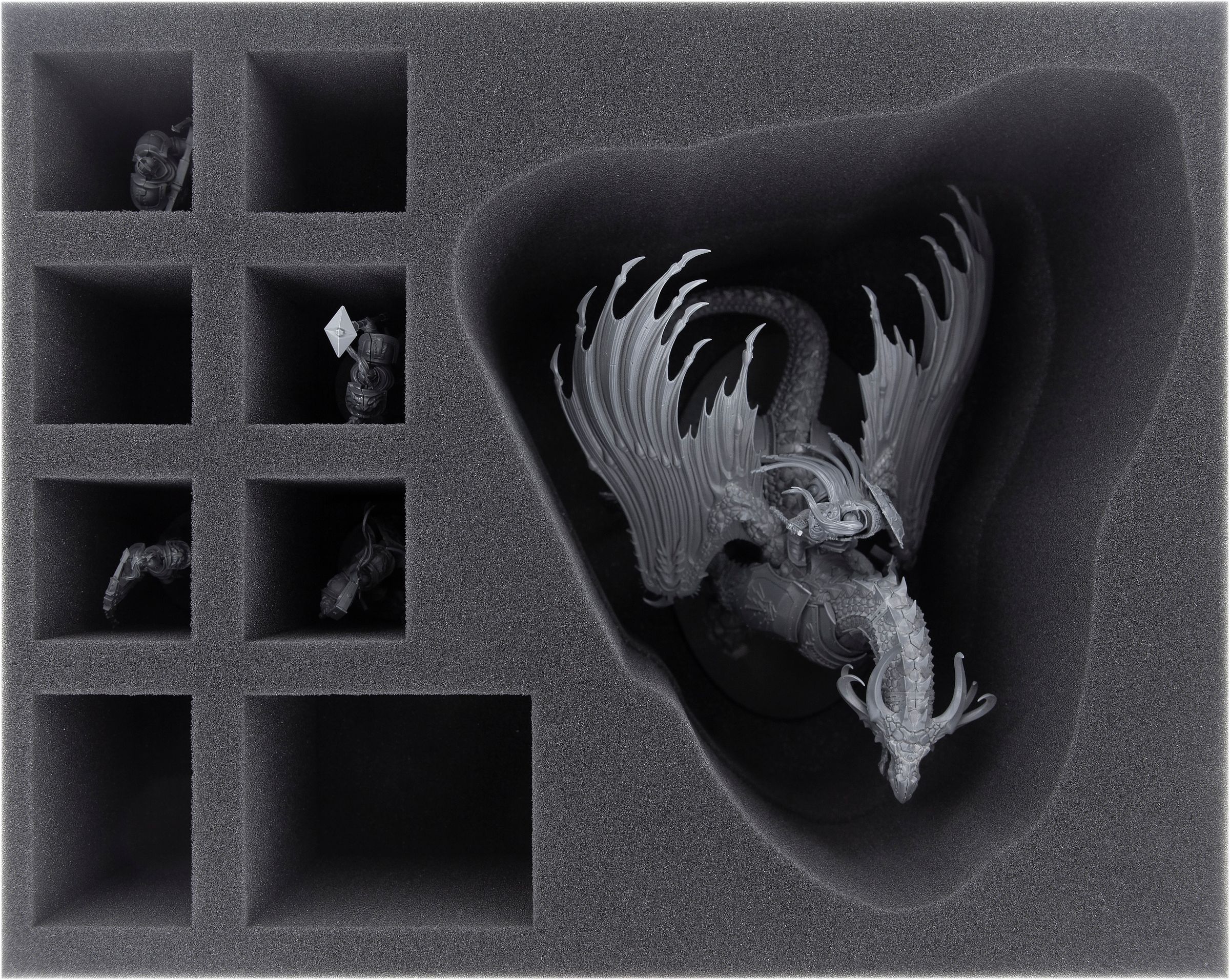 Damit auch der restliche Teil der Figur sicher in Schaumstoff gepackt ist, kommt die zweite Einlage obenauf. Diese ist mit einer miniaturengenau zugeschnittenen Aussparung versehen. Dadurch sind die empfindlichen Flügel und alle anderen filigranen Details optimal vor Beschädigungen geschützt. Wenn die Miniatur nach Stunden intensiver Arbeit schließlich bemalt ist, kannst du dich (zumindest bis zur nächsten Schlacht) entspannen, denn die Farben sind hier ebenfalls sicher vor Abrieb und Kratzern.