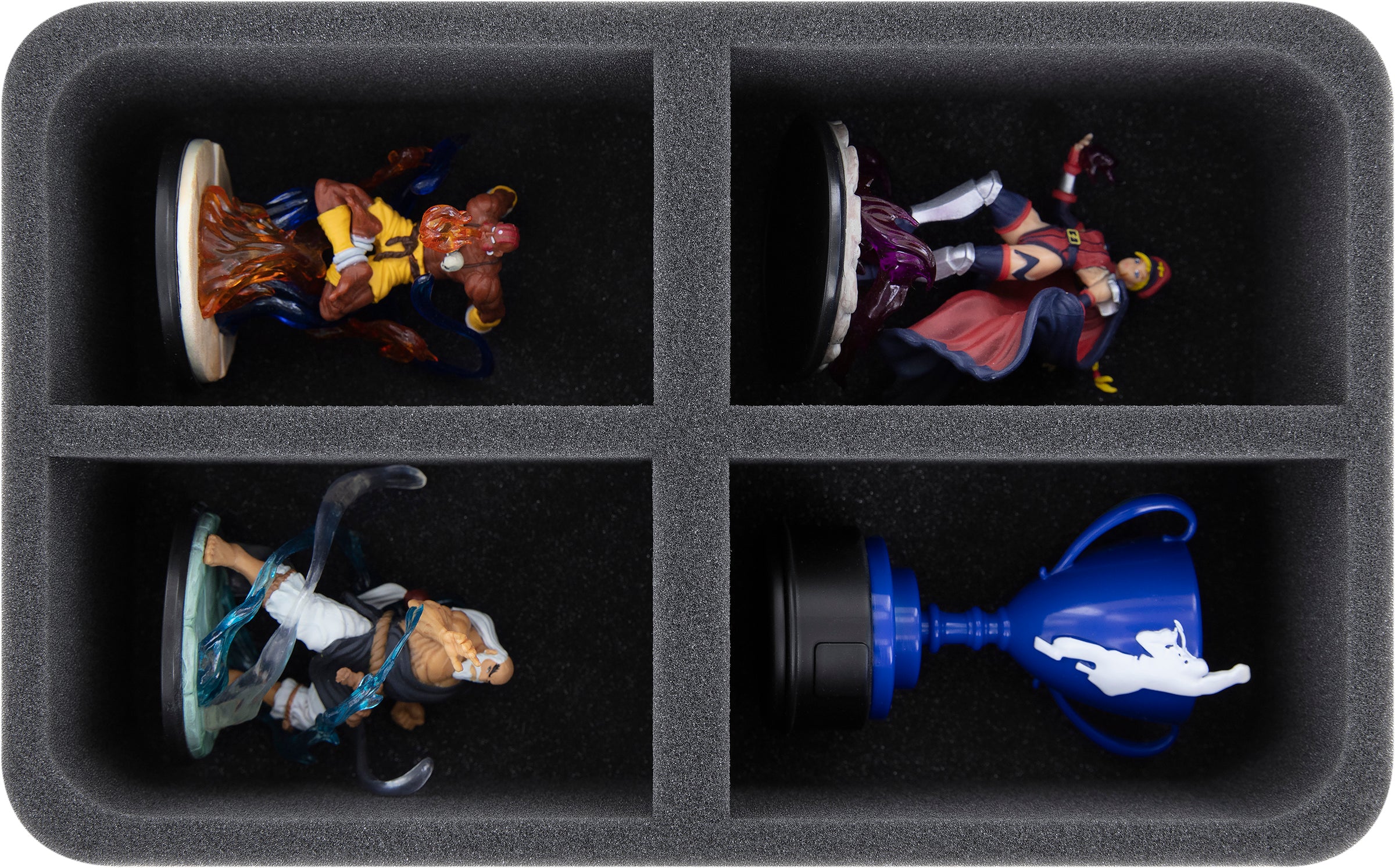 Zum Schutz deiner Miniaturen ist eine Half-Size Schaumstoffeinlage mit 4 Fächern enthalten. Egal ob Ryu, Blanka oder Chun Li, jede Miniatur deiner Sammlung bekommt hier ein eigenes, passgenaues Fach. So bleiben deine Modelle auch während des Transports sicher an ihrem Platz. Der weiche Schaumstoff schützt dadurch nicht nur die empfindlichen Teile deiner Figuren. Die Farben der bemalten Miniaturen sind hier genauso sicher vor Abrieb und Kratzern.