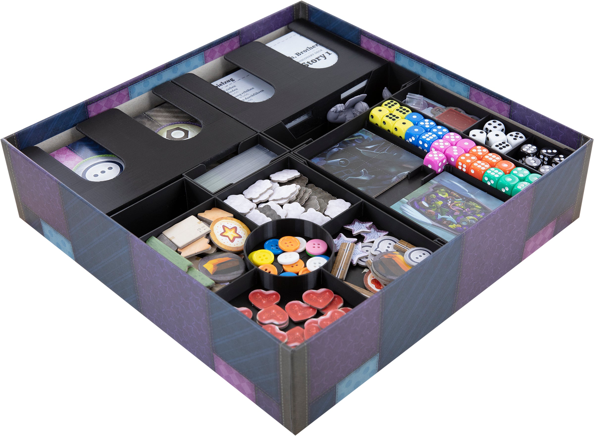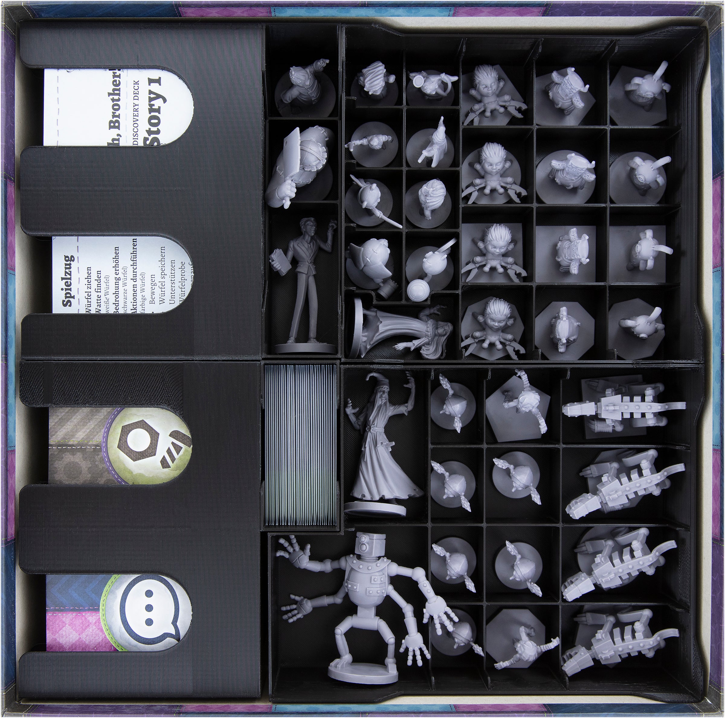 Damit es in deiner Brettspielbox nicht aussieht in einer Altraumlandschaft, haben wir den Organizer deiner Träume erschaffen. Hier bekommst du nicht nur das Spielmaterial und die Figuren des Grundspiels unter, sondern kannst auch alle Spielkomponenten der Erweiterung „Bruderherz“ ordentlich verstauen. Selbst im Schlaf findest du dich damit in deiner Spielbox zurecht und bald sind die Monster unter deinem Bett nur noch Gruselgeschichten, die du deinen Kindern erzählst.
