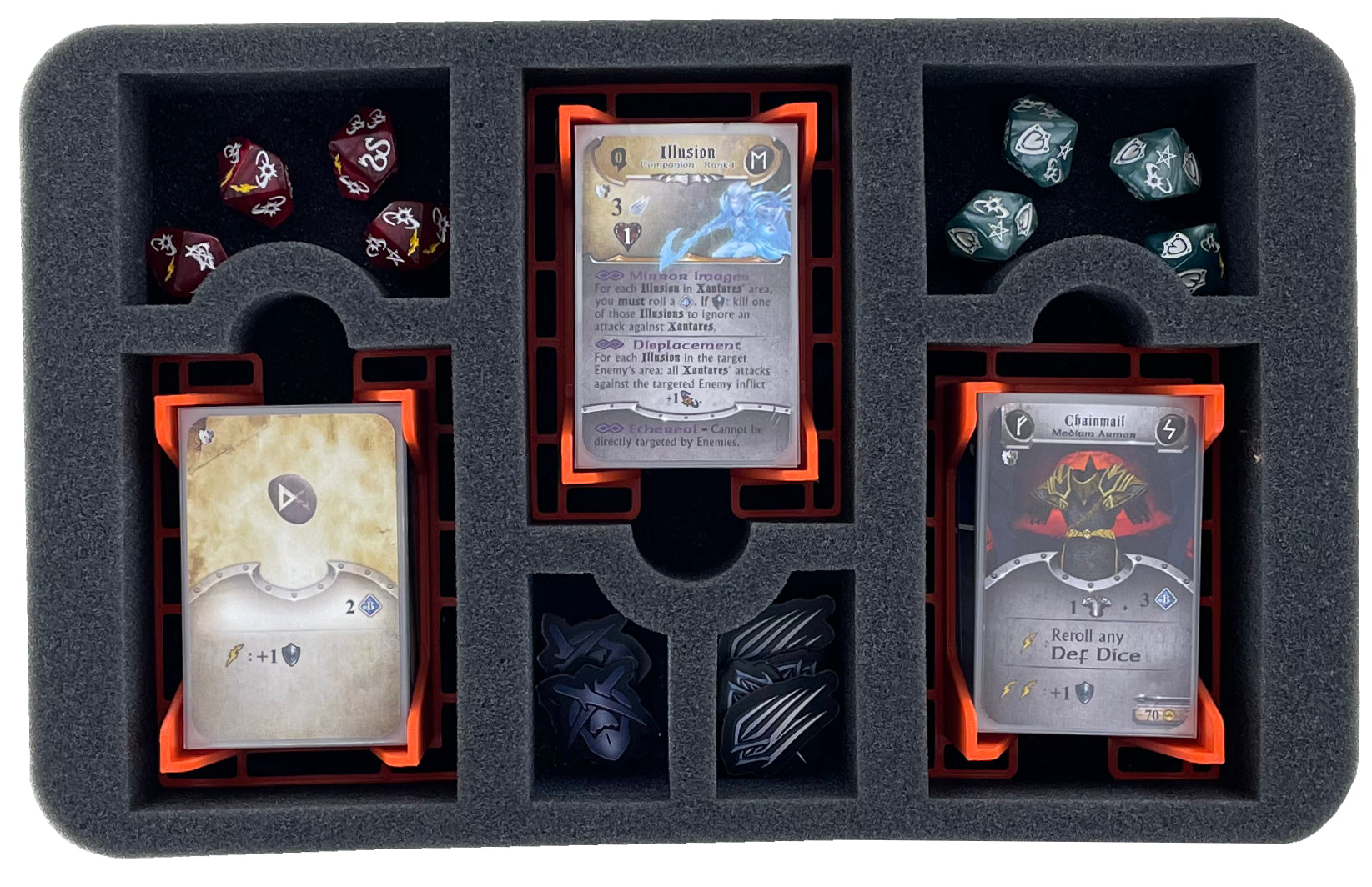 Während du den Tag rettest, kümmern wir uns um die Sicherheit deiner Miniaturen und die Ordnung deines Spielmaterials. Mit den Kartenhaltern aus Plastik und den kleineren Schaumstofffächern lässt sich das Spielmaterial ordentlich sortieren, während die größeren Schaumstofffächer deine Miniaturen vor Beschädigungen schützen. Sämtliche Karten passen auch mit Schutzhüllen in die Kartenfächer. So ist dein Spielmaterial immer griffbereit und deine Miniaturen zuverlässig vor Beschädigungen sicher. Kratzer und abplatzende Farbe auf deinen bemalten Figuren brauchst du ebenso wenig zu fürchten, wie abgebrochene Details deiner Miniaturen.
