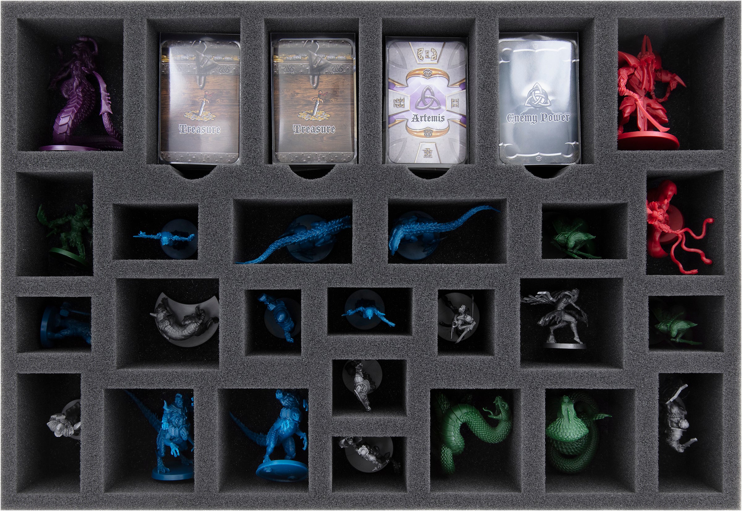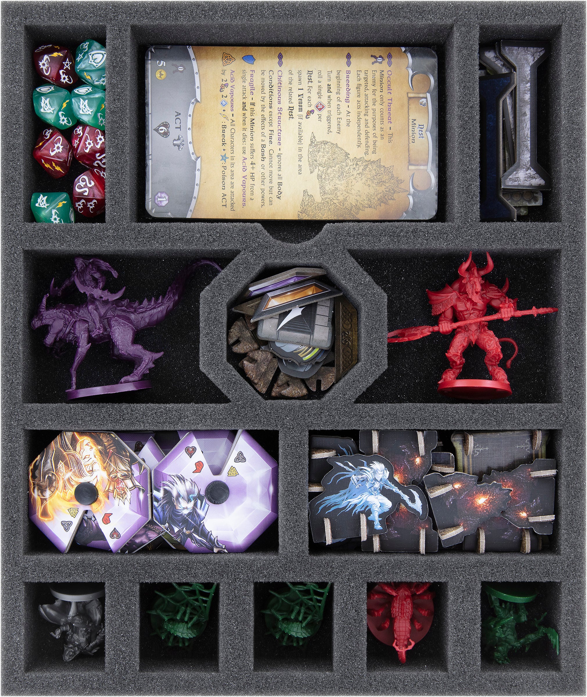 - 1 Schaumstoffeinlage mit 13 Fächern für Miniaturen, Würfel, Token, Pappaufsteller, Soul Gems und große Karten.