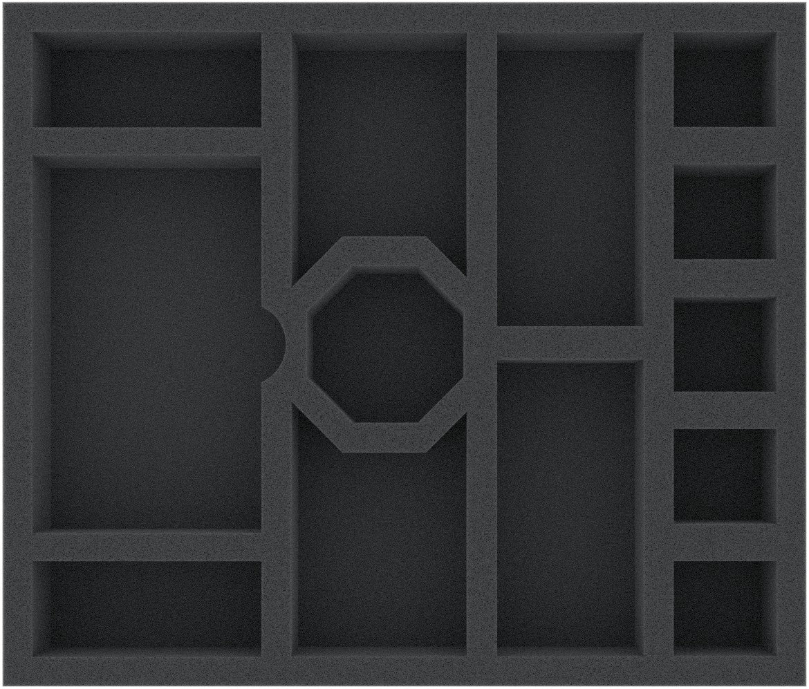 - 1 Schaumstoffeinlage mit 27 Fächern für Miniaturen, Bases und kleinformatige Karten.