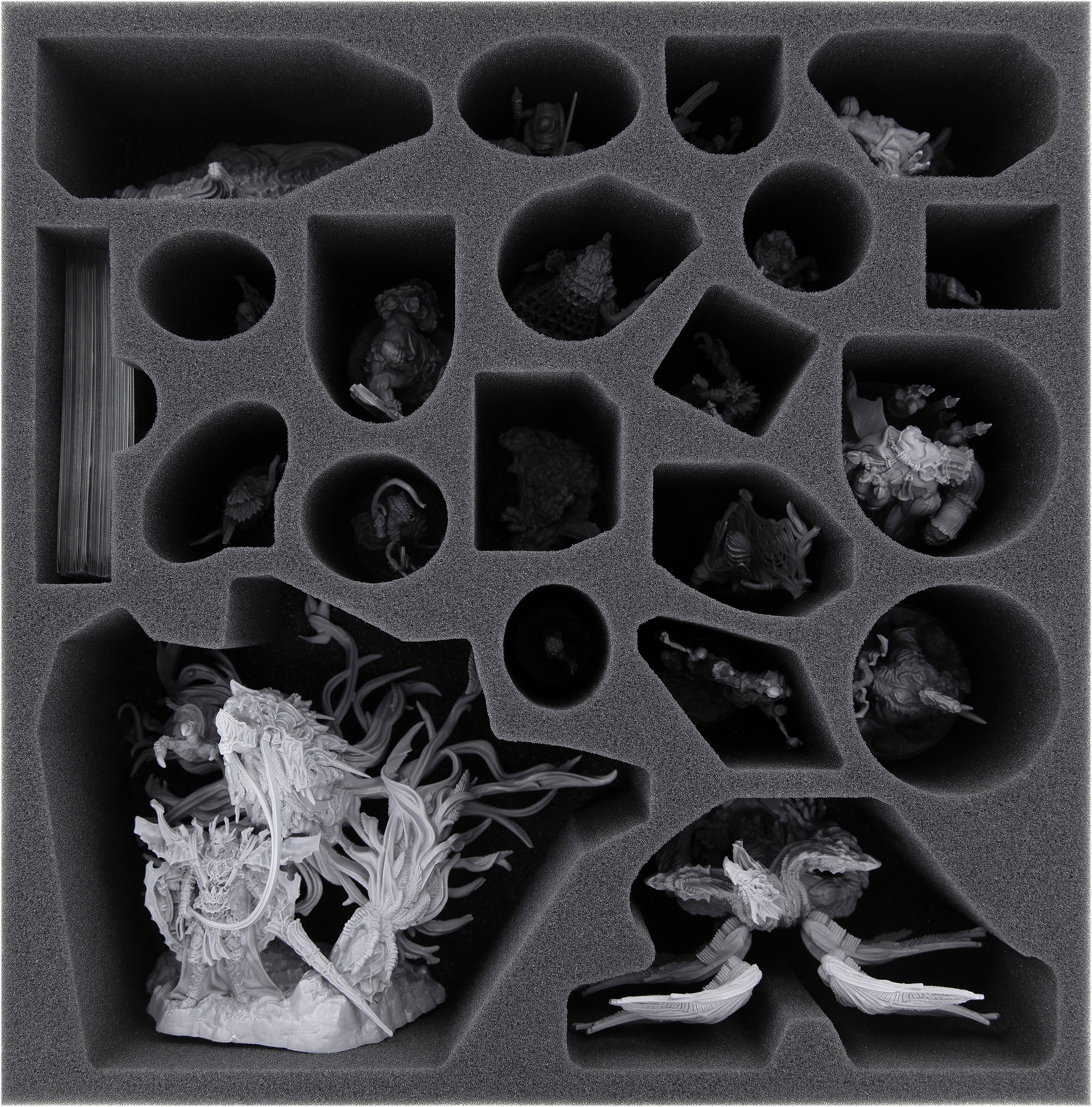 Damit die Wyrmlings, Doomwarden und die anderen Monster der Vergangenheit ebenso lange existieren, wie Fachan, Torch Bearer und die Monster der Zukunft, bekommt jede Figur ein eigenes Fach aus hochwertigem Schaumstoff. Dank des passgenauen Zuschnitts rutscht nichts umher und unterwegs bleiben die Figuren wo sie sind. Falls du deine Miniaturen bemalst, kannst du sicher sein, dass die Farben auch nach dem Transport noch unversehrt sind.