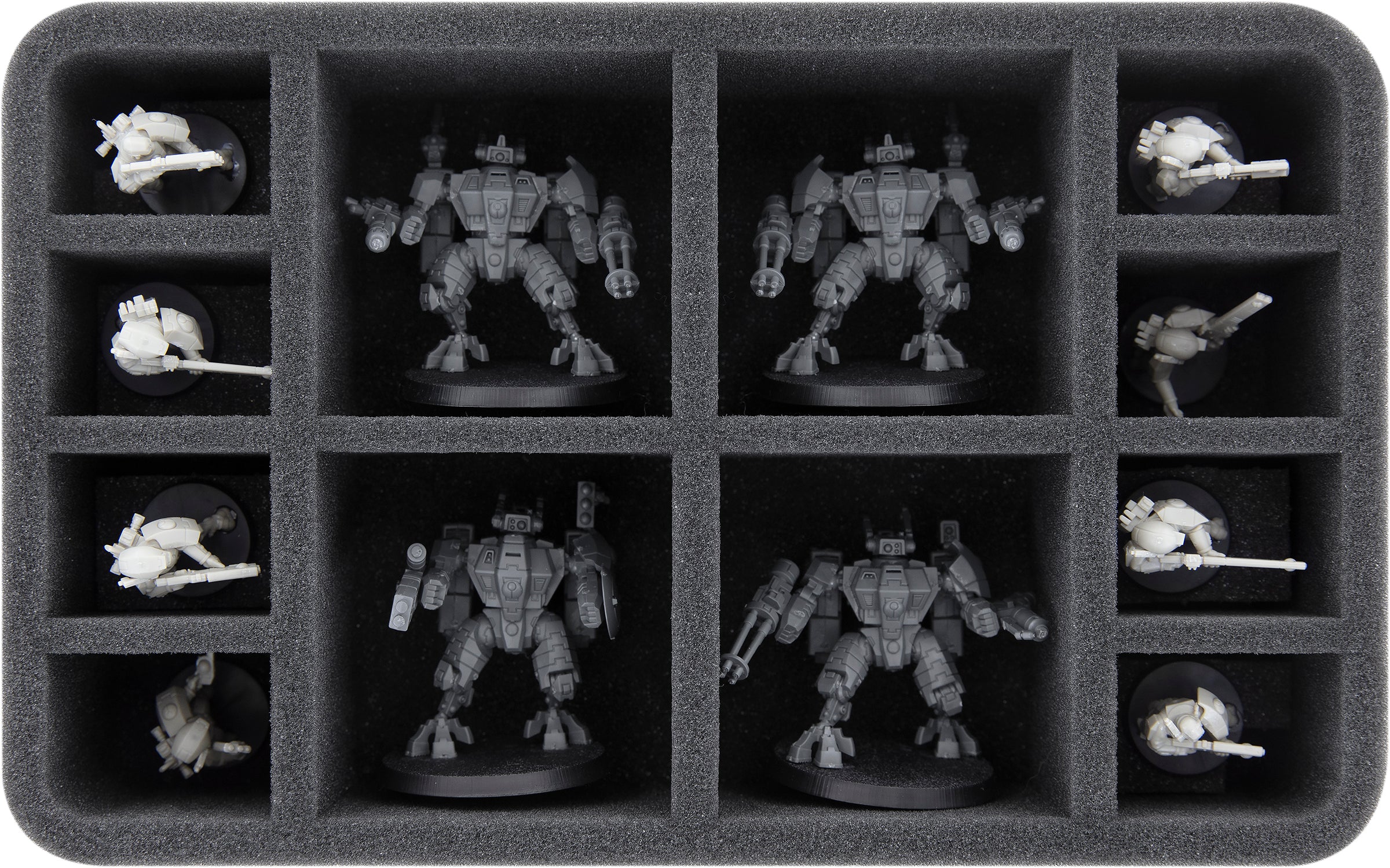 • 1 Half-Size-Schaumstoffeinlage mit 12 Fächern für z. B. 3 XV8 Crisis Battlesuits, 8 Fire Warrior (HSMFAA070BO)