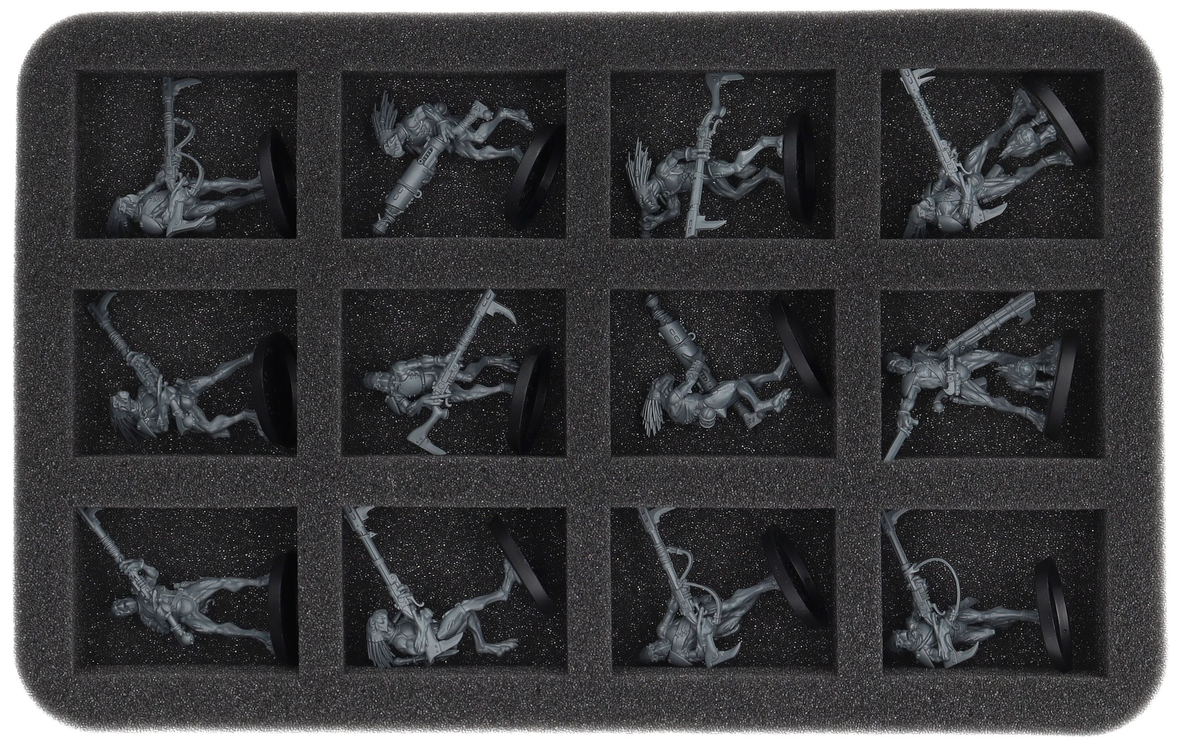 Auf dieser Feldherr Schaumstoffeinlage hast du Platz für bis zu 12 Miniaturen deiner Armee. Das Insert eignet sich zum Beispiel besonders gut zum Aufbewahren der Kroot, Jäger und Modellen mit ähnlichen Abmessungen.