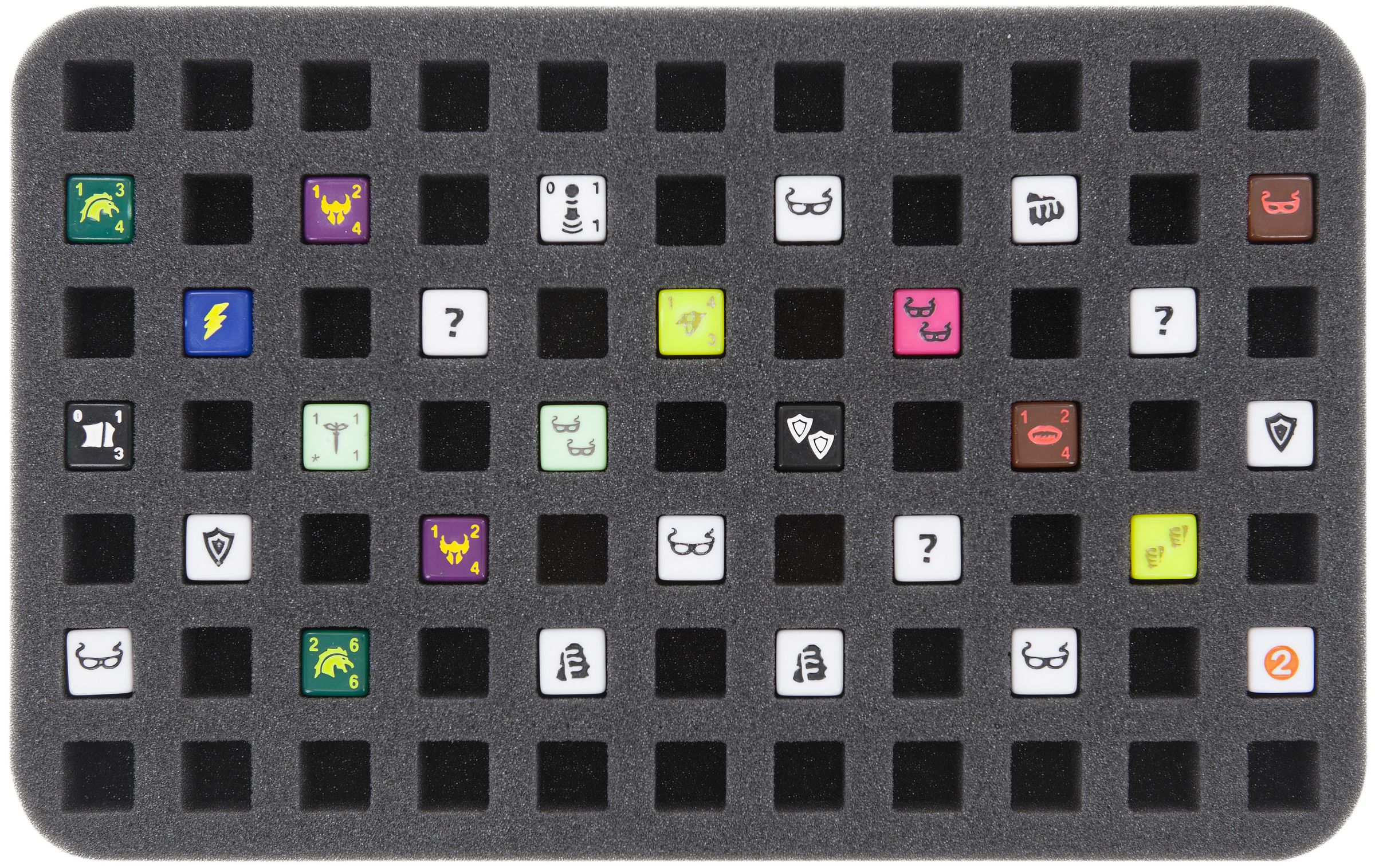 Die Würfelmatte verfügt über 77 Fächer. Jedes der Fächer ist 14 mm lang x 14 mm breit x 15 mm tief. Damit kannst du W6-Würfel mit einer Kantenlänge von 14 mm in der Einlage verstauen.