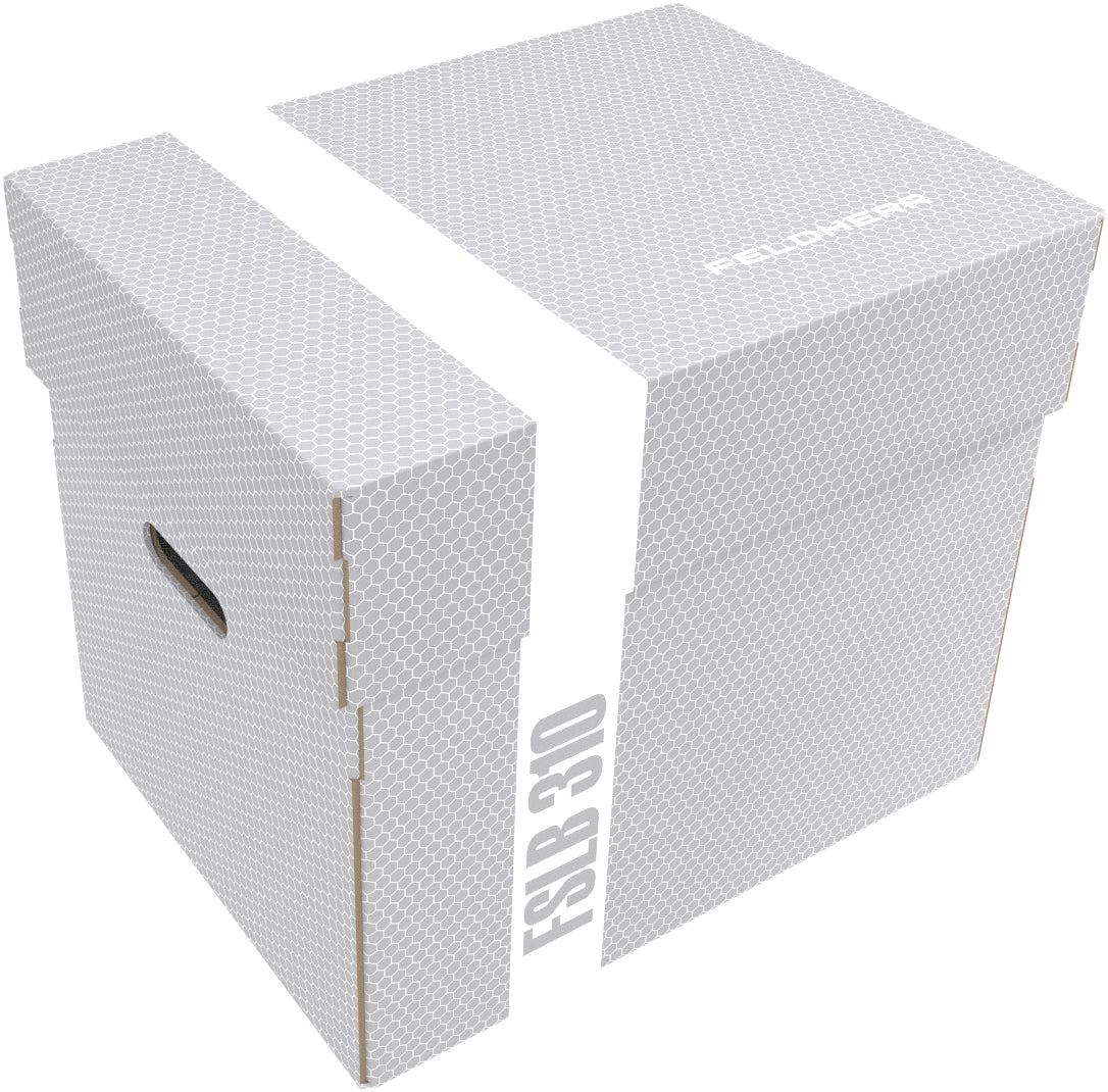 Die Lagerbox FSLB310 besteht aus beschichtetem, doppelwelligem Karton und ist damit einerseits sehr leicht und dabei trotzdem stabil. Der aufsetzbare Deckel schützt den Inhalt zuverlässig vor Staub und anderen äußeren Einflüssen. Mit den beiden kunststoffverstärkten Tragegriffen an den Seiten lässt sich die Box bequem transportieren.