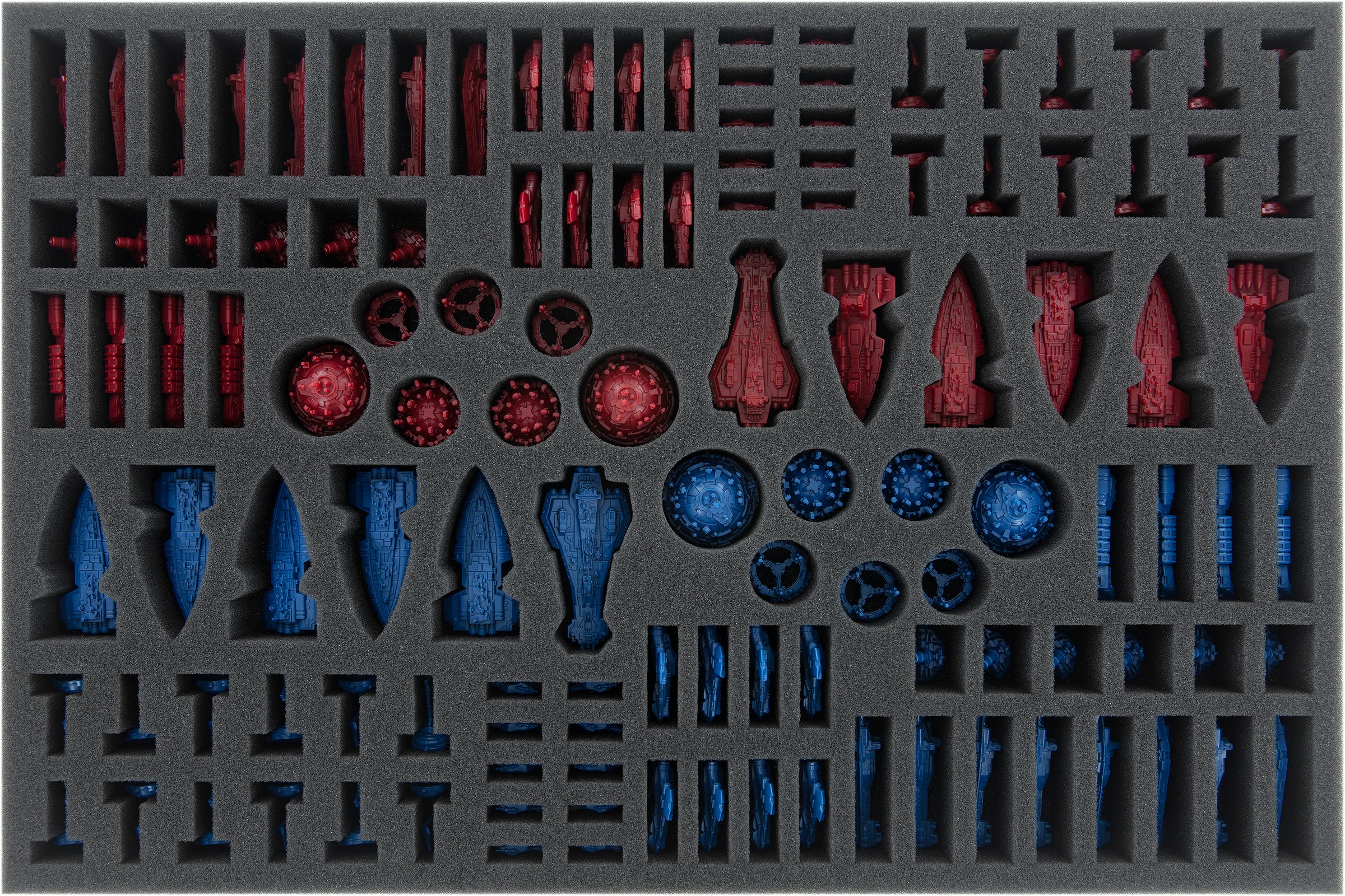 Von den Kriegssonnen über die Schlachtschiffe bis zur Infanterie – jede Plastikfigur ist rundum sicher in Schaumstoff gepackt. Passgenaue Fächer sorgen dafür, dass die Miniaturen auch unterwegs nicht umherrutschen oder gegeneinanderstoßen. Dadurch sind nicht nur feingliedrige Teile vor Beschädigungen geschützt, auch die Farben bemalter Figuren sind sicher vor Abrieb und Kratzern.