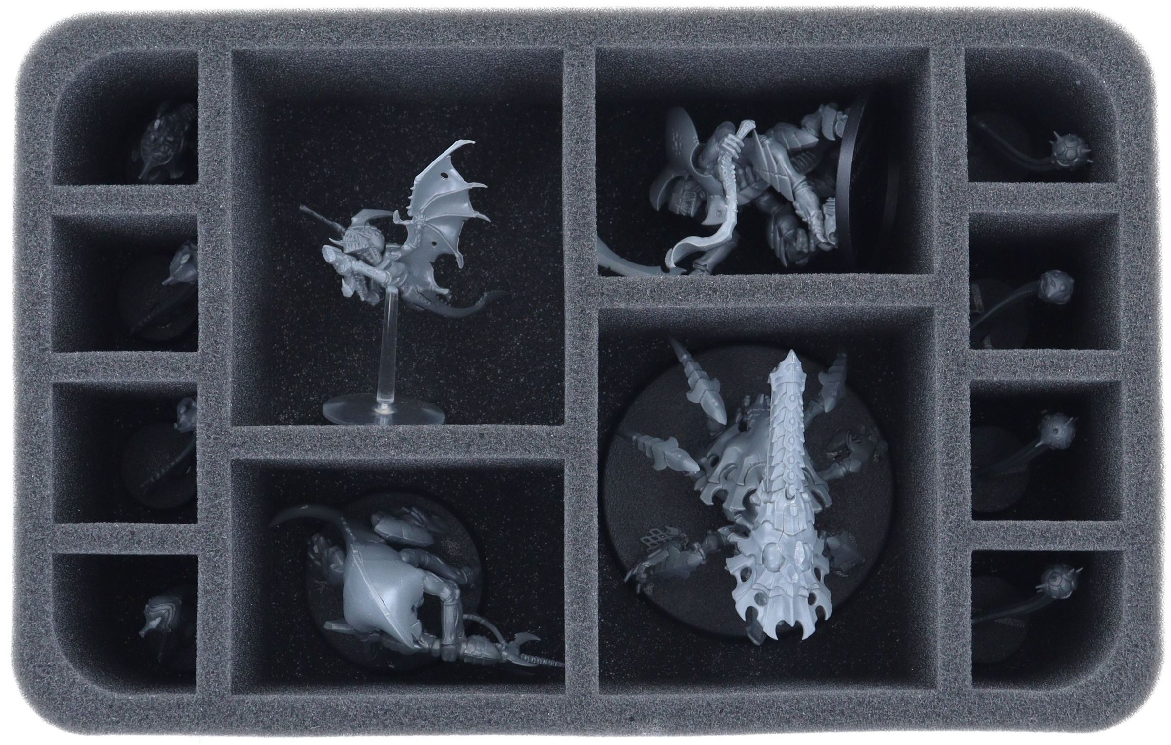 Auf dieser Feldherr Schaumstoffeinlage hast du Platz für bis zu 12 Miniaturen deiner Armee. Die unterschieldich großen Fächer eignen sich ideal zur Aufbewahrung von Modellen, wie beispielsweise Biovoren.