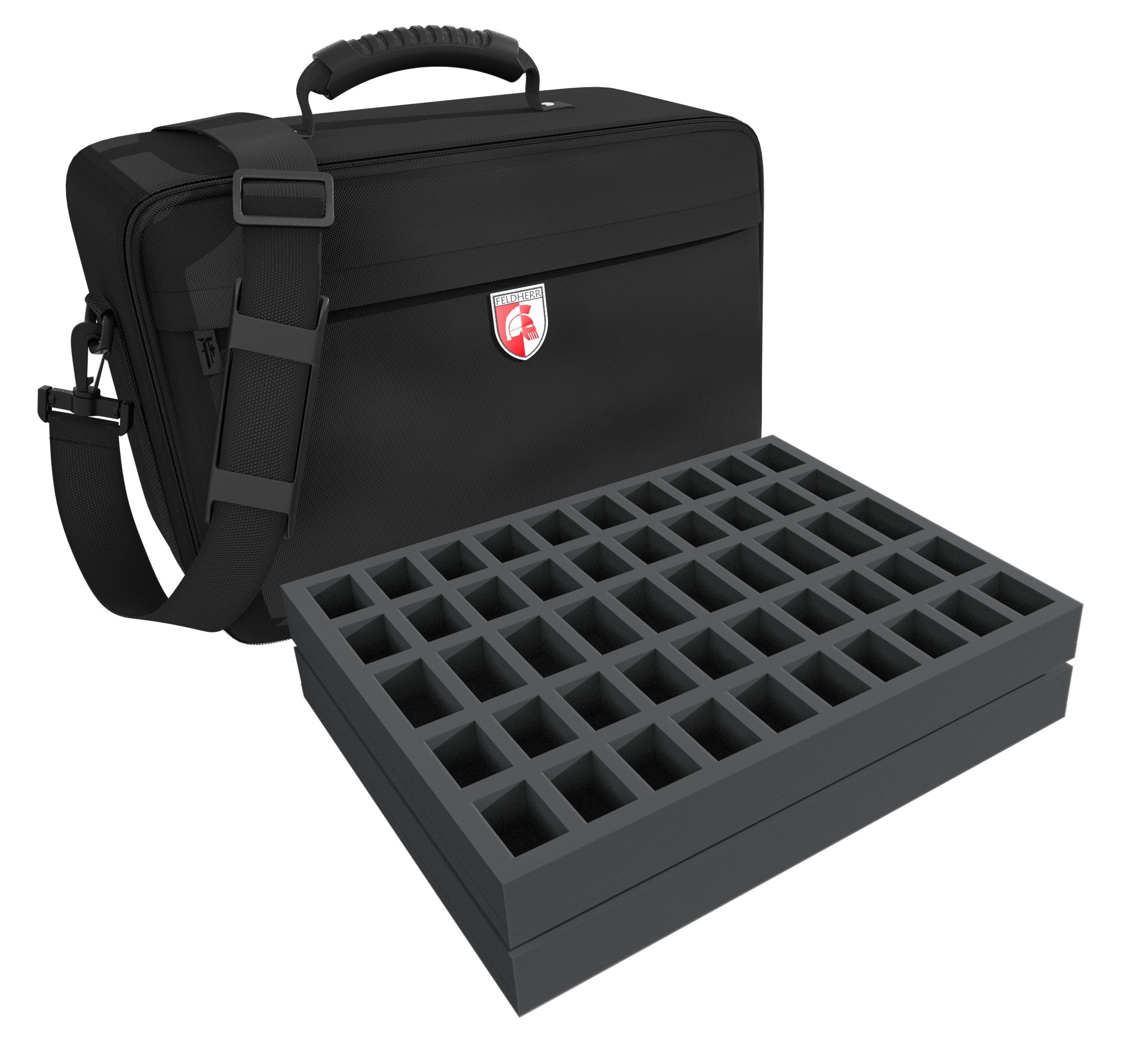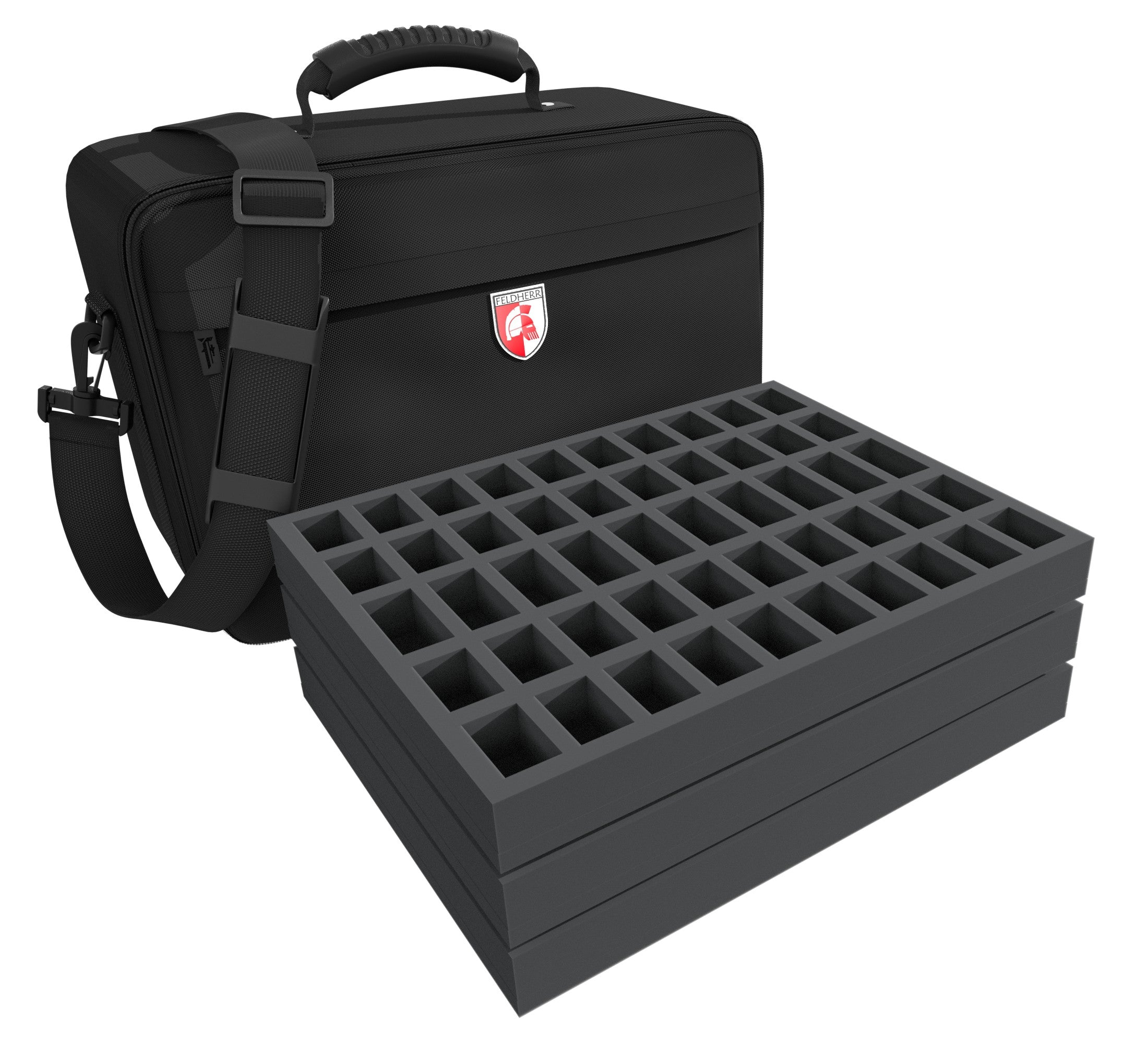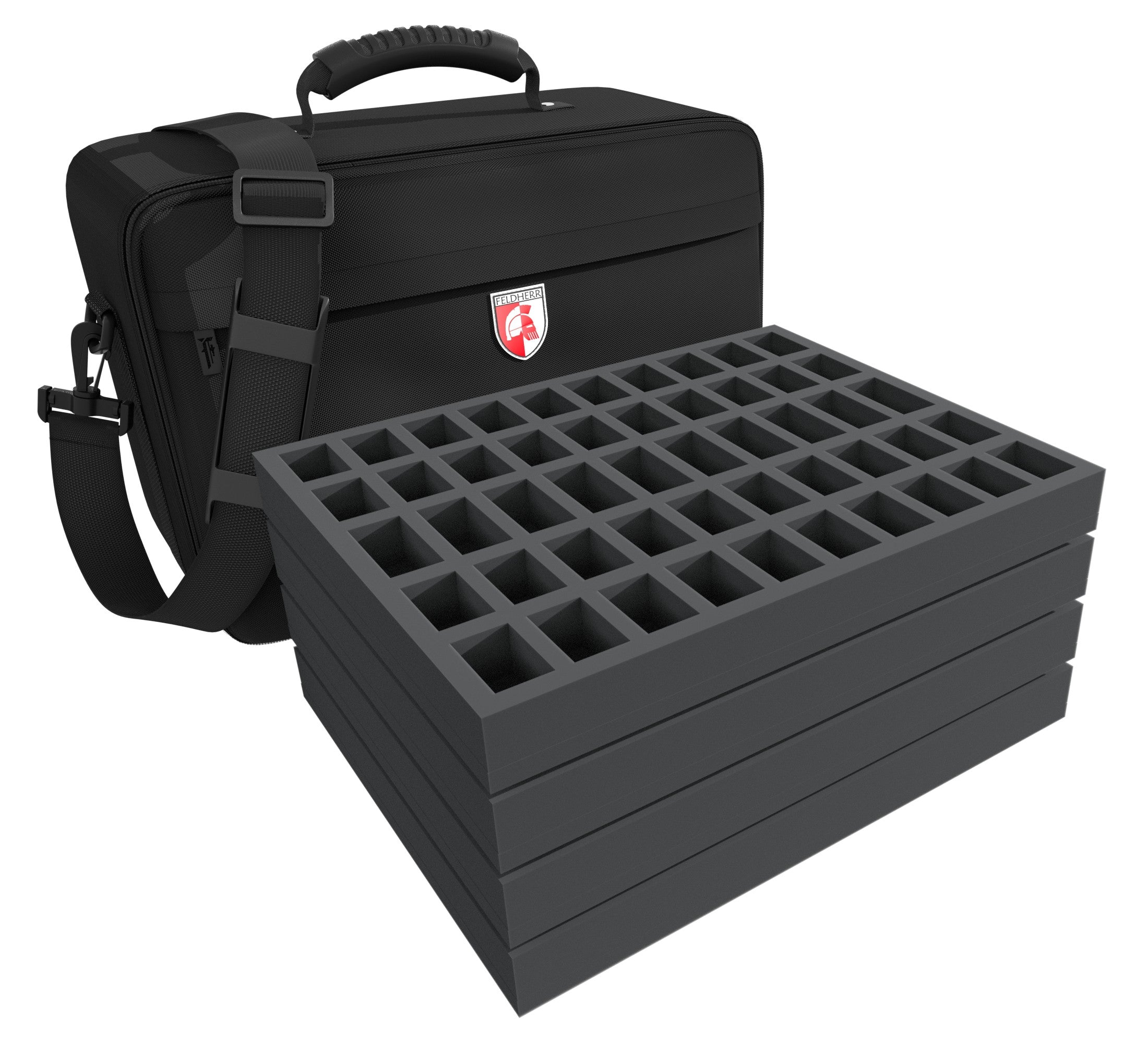 Hochwertige Feldherr Miniaturentasche für 250 Figuren im klassischen 25 mm / 28 mm Tabletop Figuren Maßstab. Die Figurentasche wird mit 5 Schaumstoffeinlagen geliefert und kann sofort benutzt werden. In die 5 Einlagen für jeweils 50 Miniaturen passen nahezu alle Figuren die auf einer 25mm Base (Platte) stehen - wie zum Beispiel für die Spiele Warhammer Fantasy, 40.000, Zombicide oder Herr der Ringe.