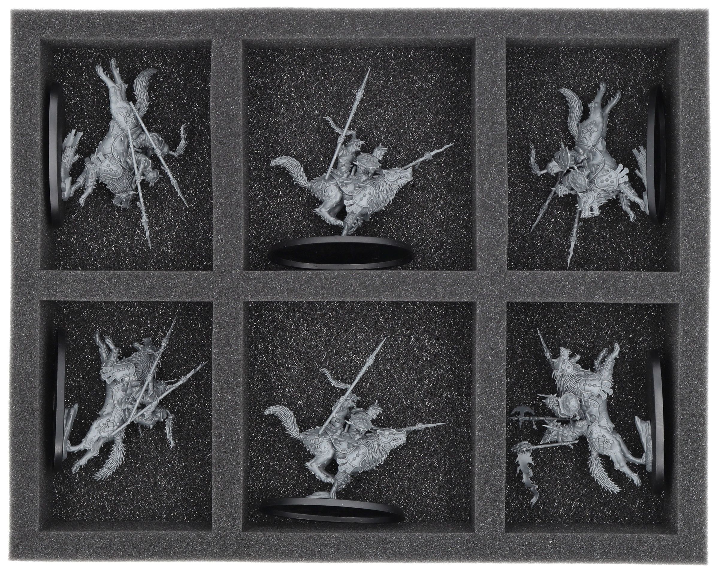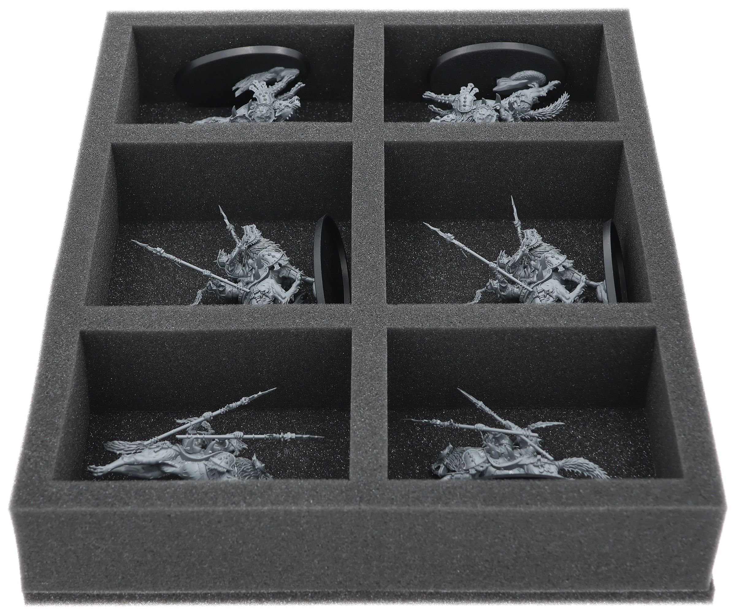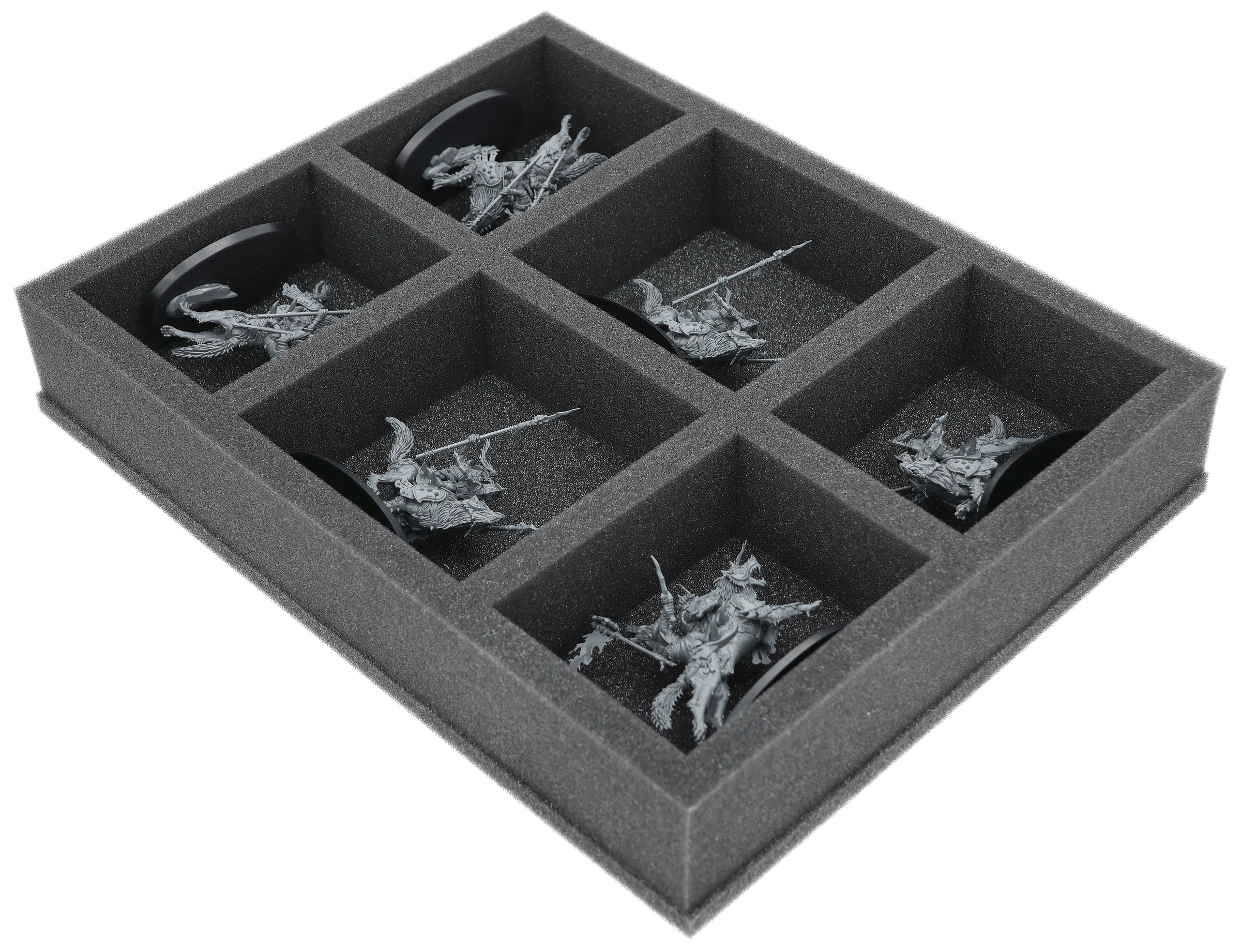 Auf dieser Full-Size-Schaumstoffeinlage hast du 6 gleich große Fächer, in denen bis zu 6 mittelgroße Modelle der Gloomspite Gitz sicher und ordentlich untergebracht werden können.