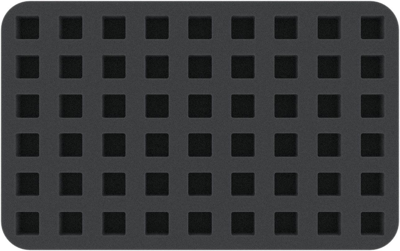 Die Schaumstoffeinlage mit 54 quadratischen Ausstanzungen 16,5 mm x 16,5 mm für Warhammer Miniaturen. In diesem Schaumstoff kannst du 54 Wahrammer Figuren platzsparend und sicher transportieren sowie verstauen.