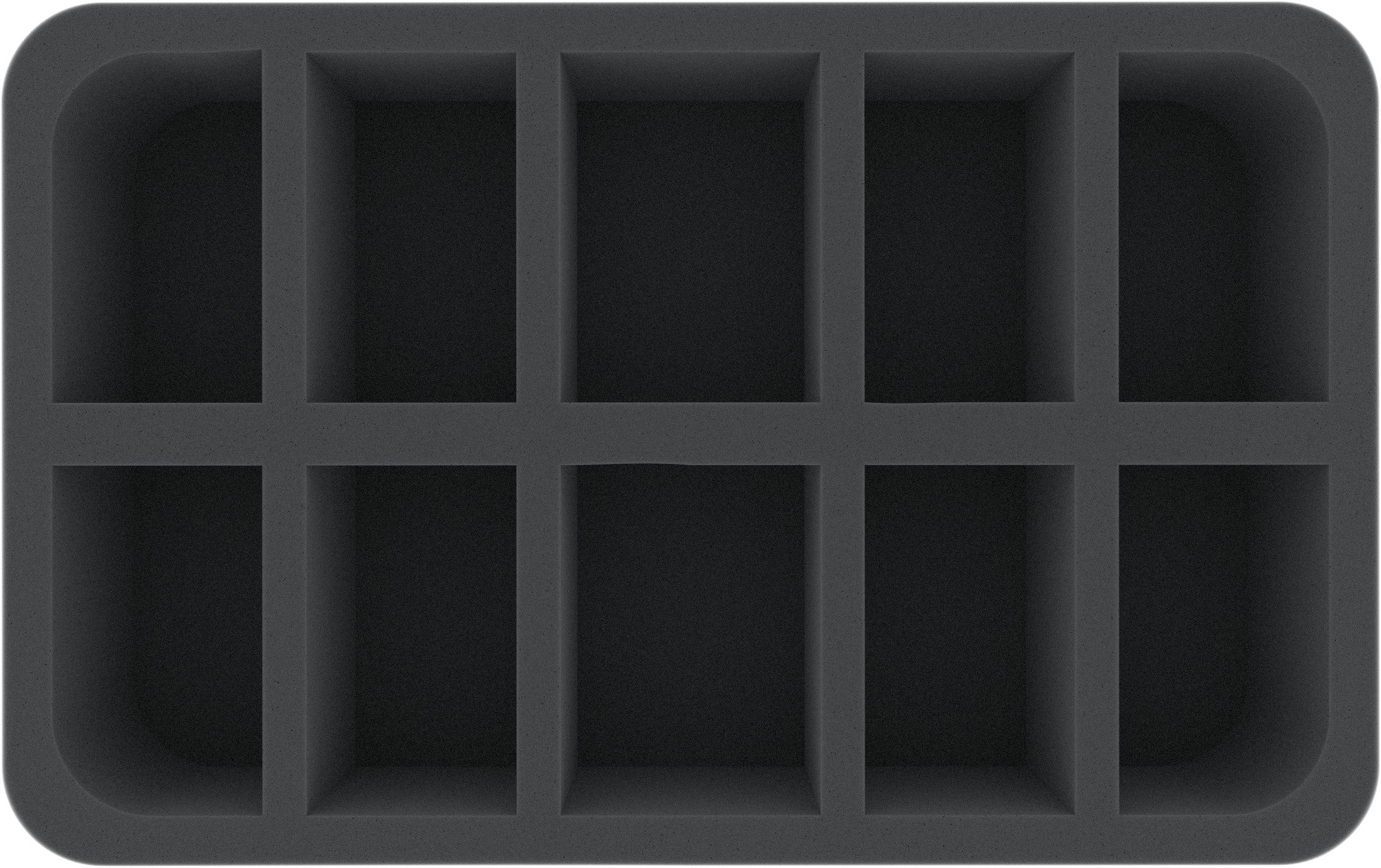 Die Schaumstoffeinlage ist optimal für größere Warhammer Miniaturen bis 50 mm Base. Die Matte umfasst zehn Fächer. So kannst du deine Figuren einordnen, sortieren und sicher transportieren.