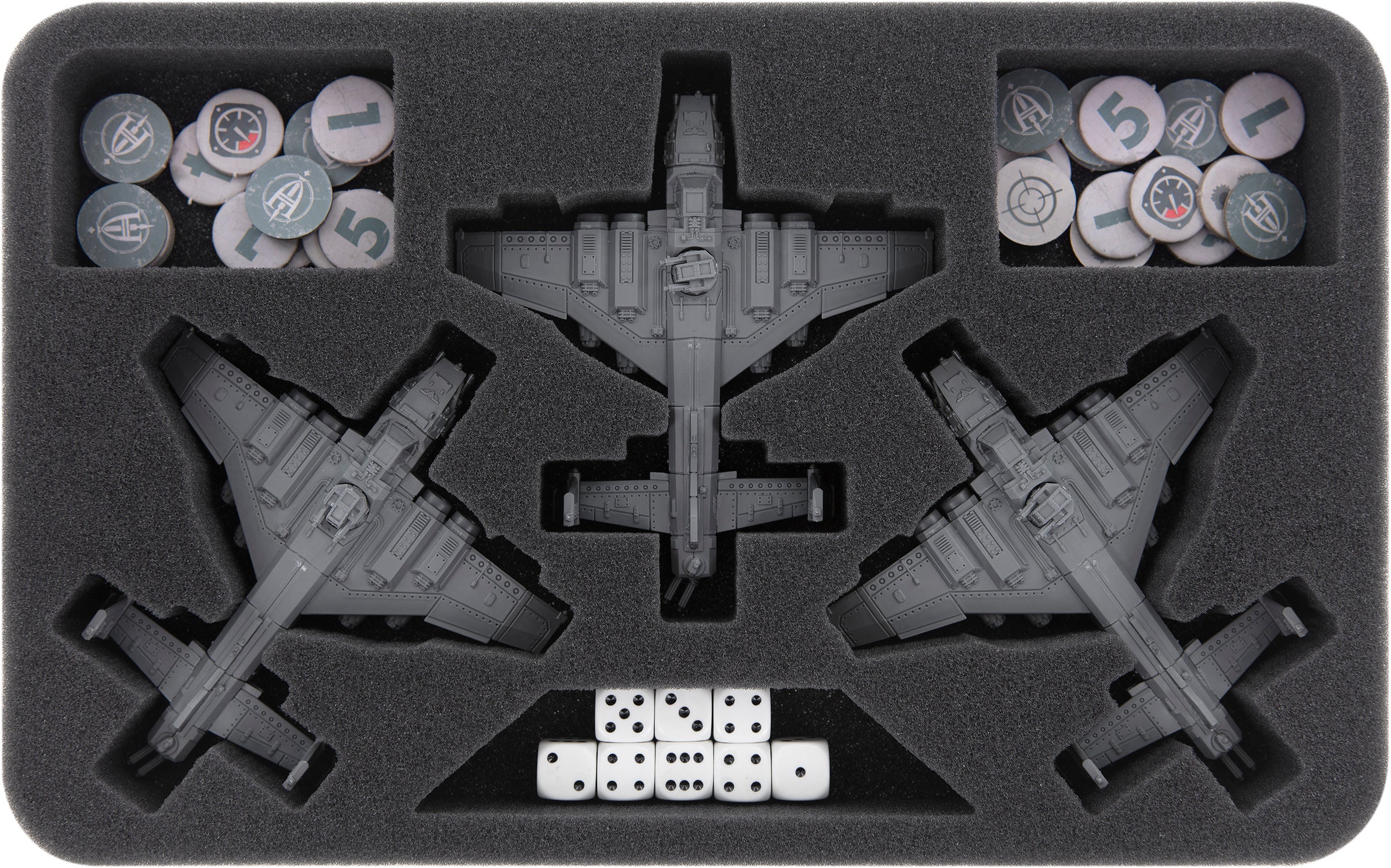 Die beiden Inserts für die Flugzeugmodelle verfügen jeweils über miniaturengenau geschnittene Fächer in denen du den Thunderbolt oder den Fury Fighter beziehungsweise entweder den Marauder Bomber oder Destroyer sicher unterbringen kannst. Auch Flugstäbe und Spielmaterial wie Würfel und Marker bringst du in den Schaumstoffeinlagen ordentlich sortiert unter.