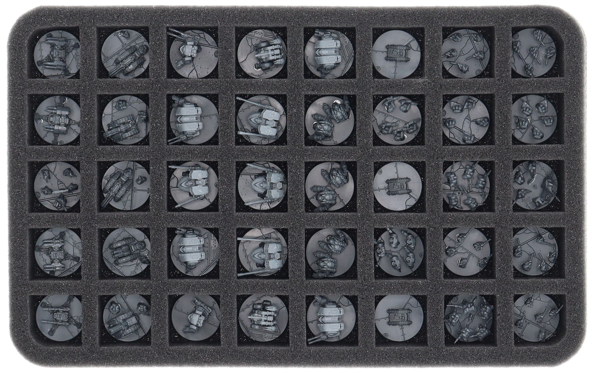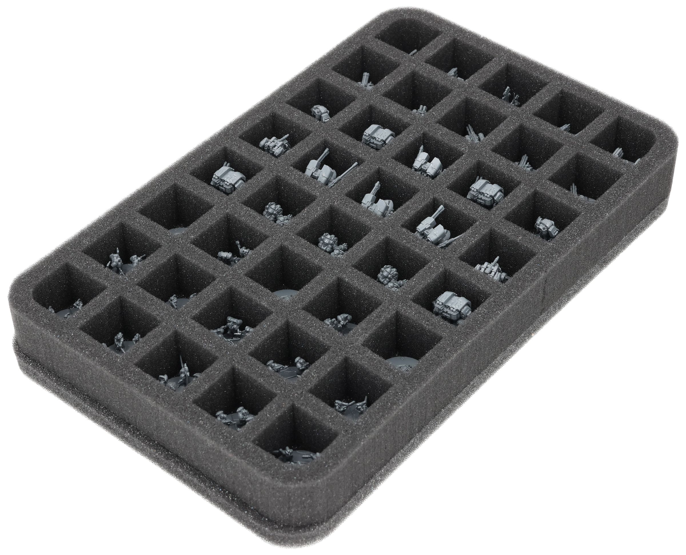 Auf dieser Feldherr Schaumstoffeinlage hast du Platz für bis zu 40 Miniaturen deiner Armee. Die Fächer eignen sich hervorragend zur Aufbewahrung von Infanteriemodellen der Legiones Astartes (z. B. Space Marines), Legiones Astartes Support (z. B. Leviathan Dreadnoughts, Legion Rapier, Legion Tarantula), sowie Truppen des Solar Auxilia, Solar Auxilia Support (z. B. Auxilia Rapier, Auxilia Tarantula, Solar Auxilia Cyclops) und Miniaturen mit ähnlichen Abmessungen.