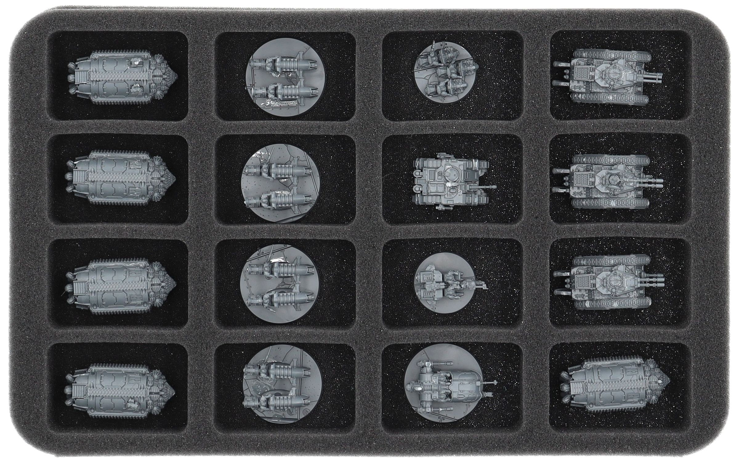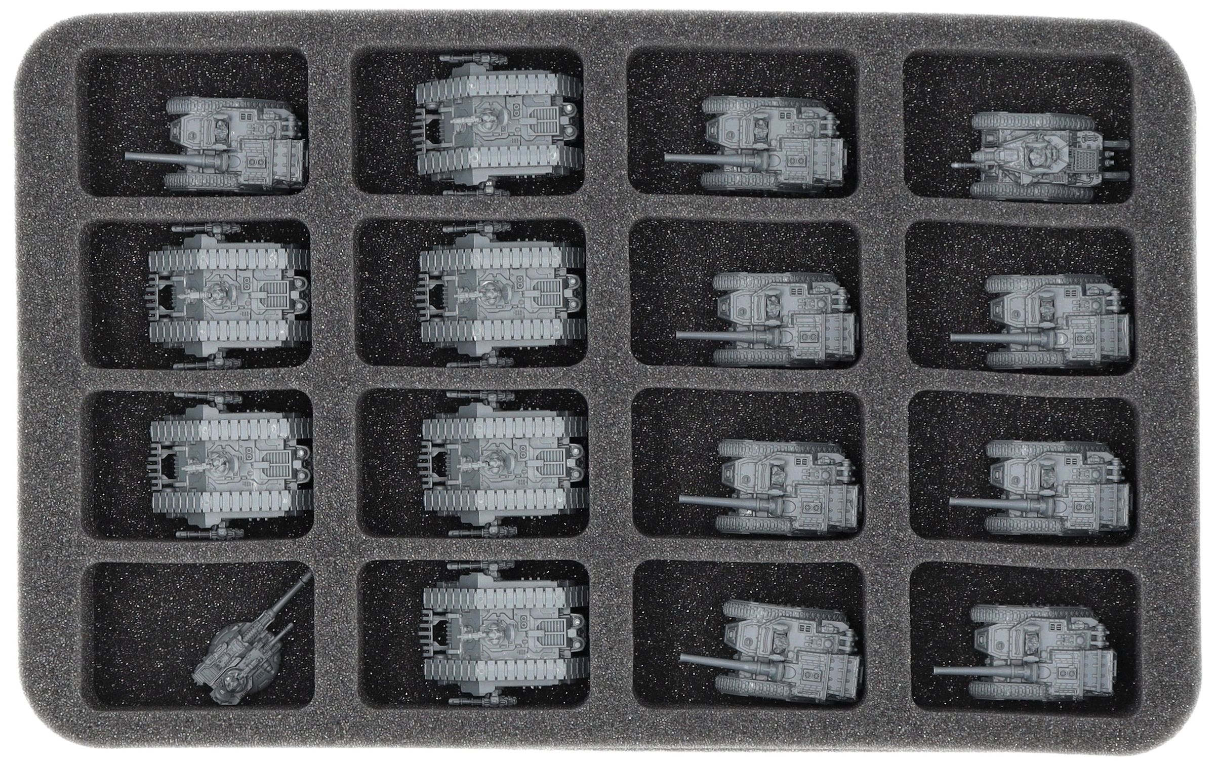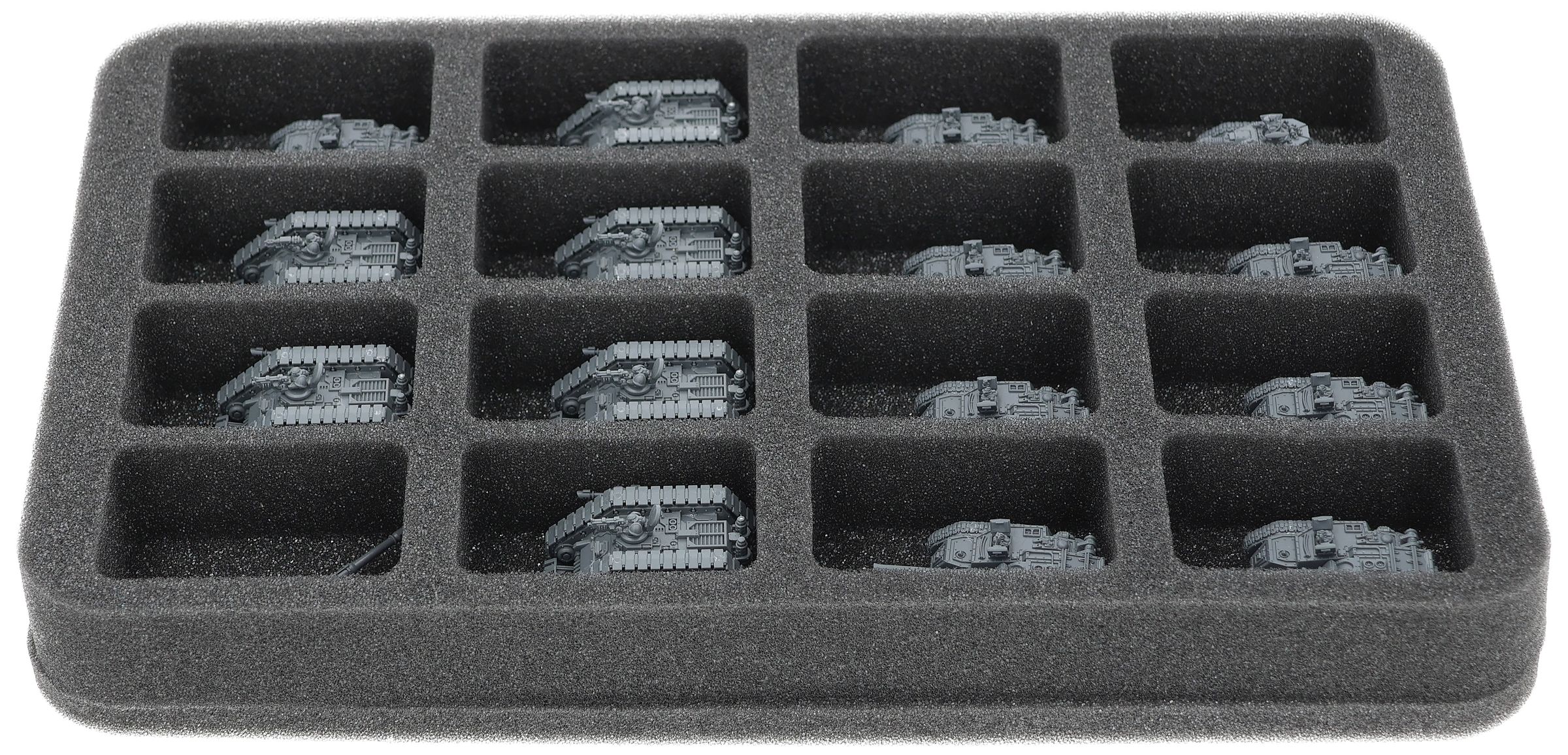 Auf dieser Feldherr Schaumstoffeinlage hast du Platz für bis zu 16 Miniaturen deiner Armee. Die Fächer eignen sich hervorragend zur Aufbewahrung für Land Raider Proteus der Legiones Astartes sowie für Medusa und Basilisk Batteries der Solar Auxilia und Miniaturen mit ähnlichen Abmessungen.