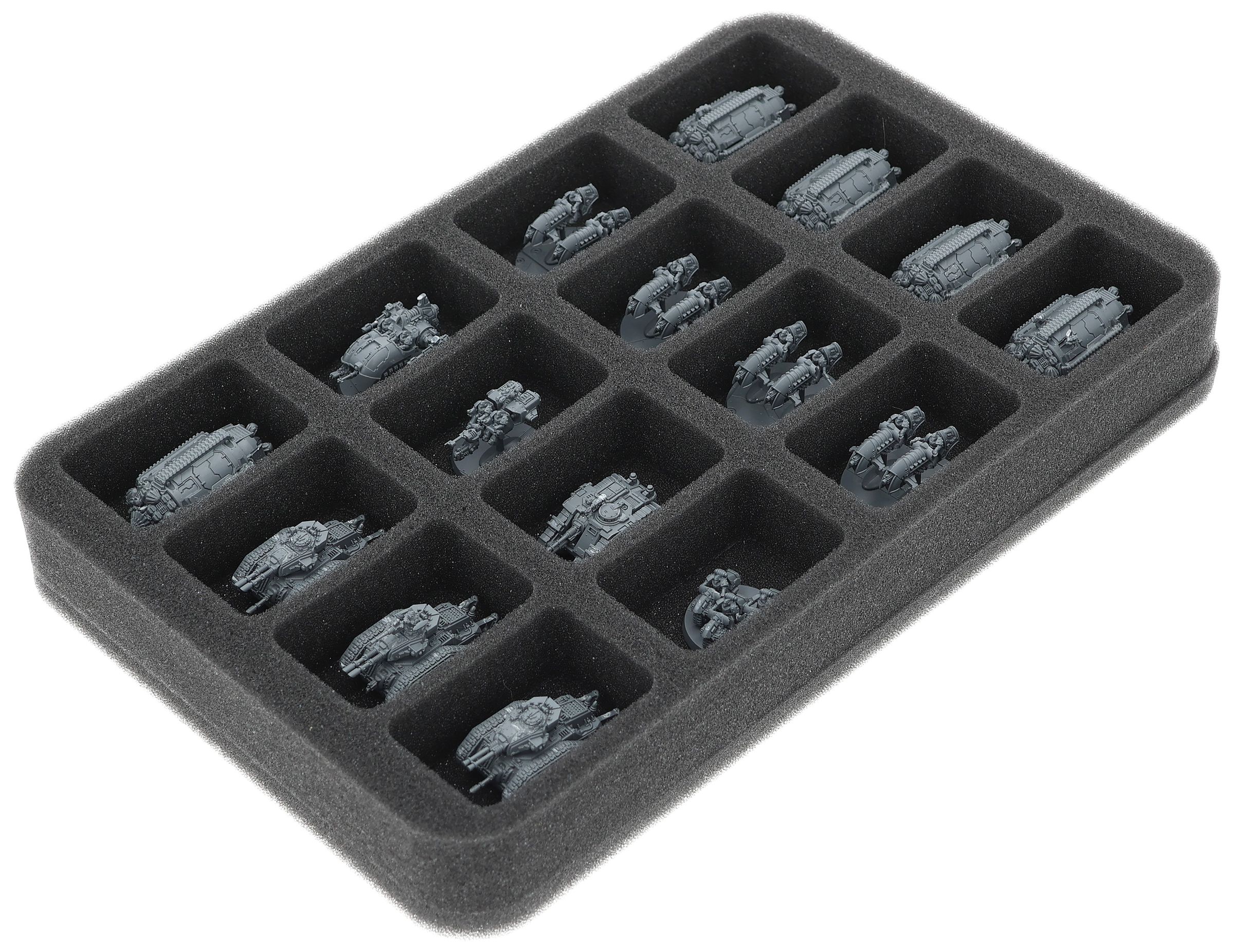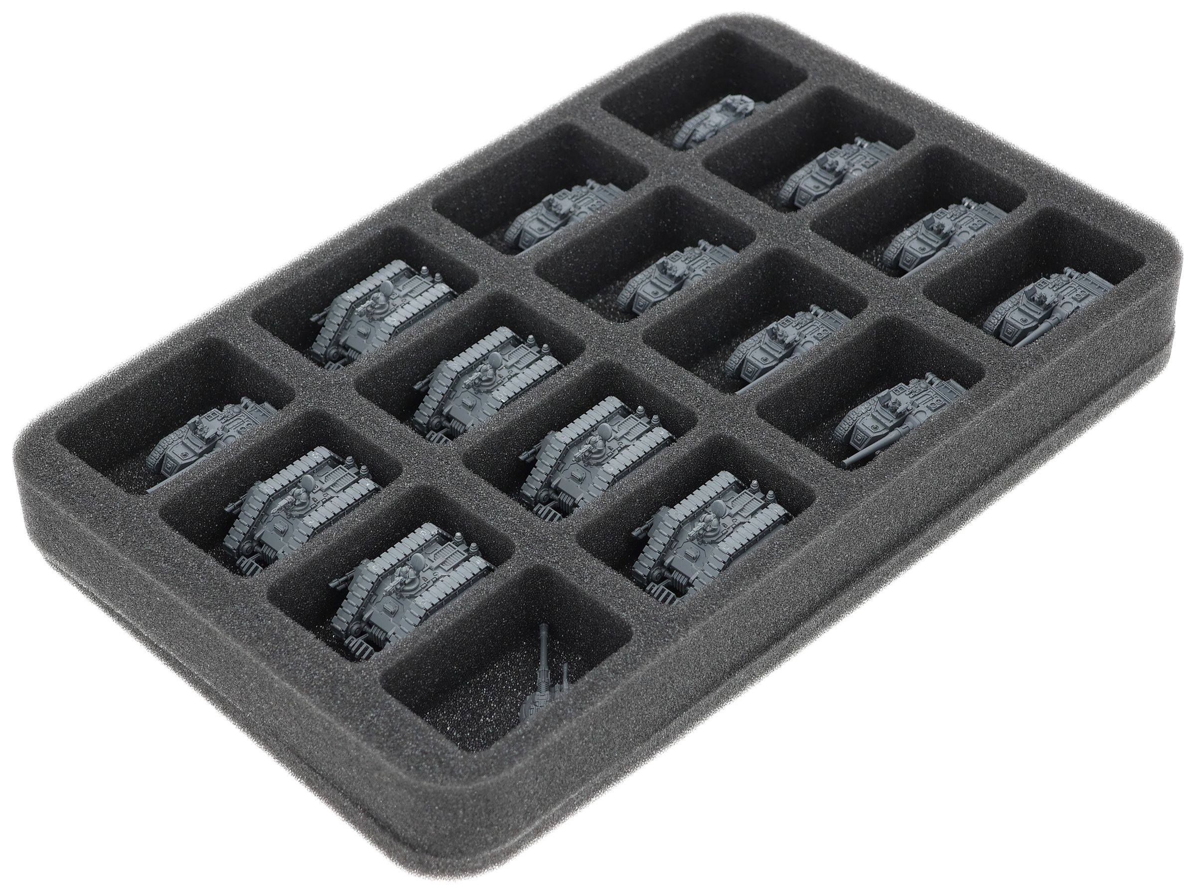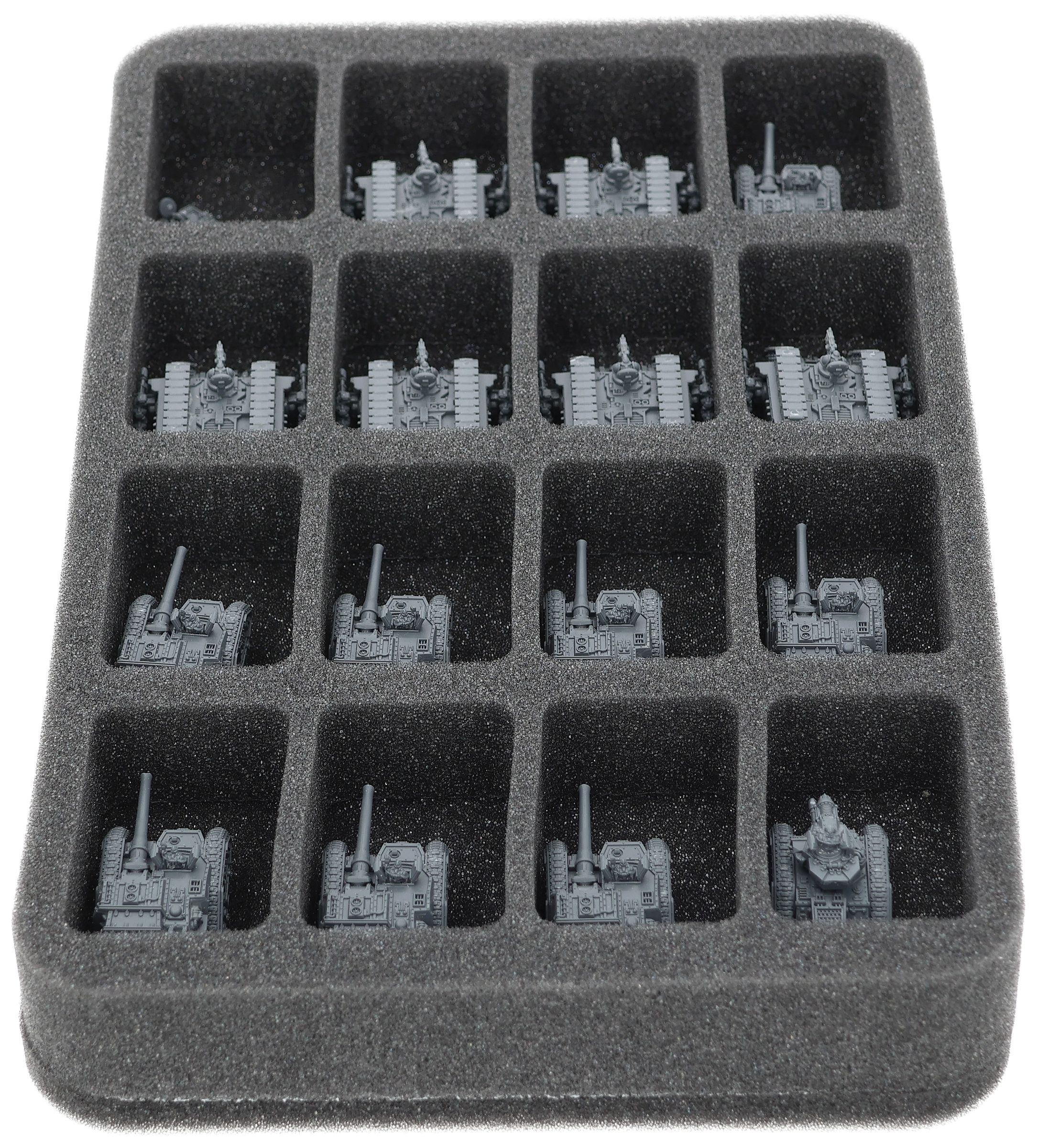 Auf dieser Feldherr Schaumstoffeinlage hast du Platz für bis zu 16 Miniaturen deiner Armee. Die Fächer eignen sich hervorragend zur Aufbewahrung für Land Raider Proteus der Legiones Astartes sowie für Medusa und Basilisk Batteries der Solar Auxilia und Miniaturen mit ähnlichen Abmessungen.