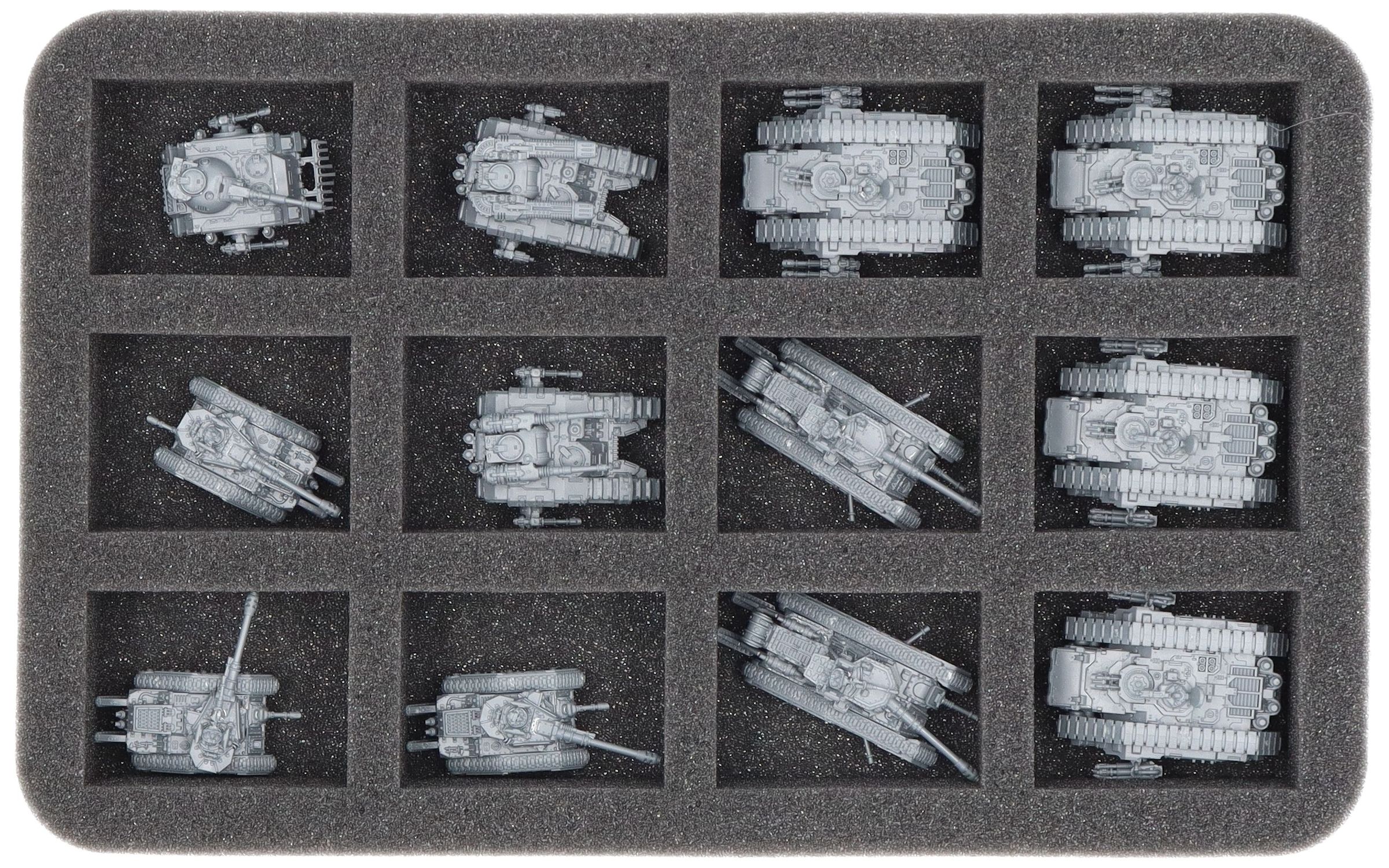 Auf dieser Feldherr Schaumstoffeinlage hast du Platz für bis zu 12 Miniaturen deiner Armee. Die Fächer eignen sich besonders gut zur Aufbewahrung von Panzern wie Spartan Assault Tank, Sicaran, Predator, Leman Russ und Malcador Kampfpanzern, sowie Miniaturen mit ähnlichen Abmessungen.
