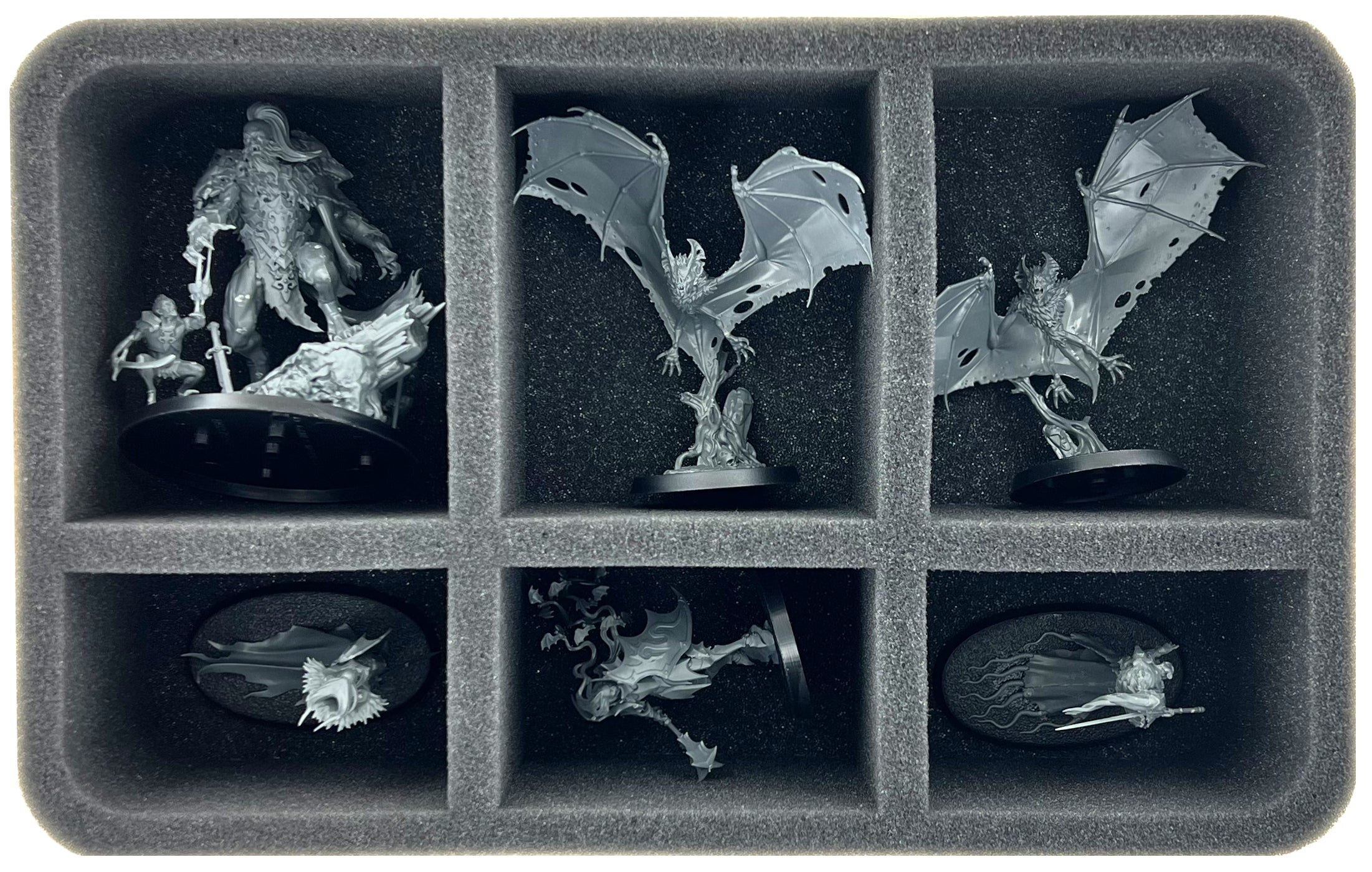 - 1 Half-Size Schaumstoffeinlage mit sechs Fächern für Miniaturen wie Radukar the Beast, Lady Annika, Kritza, Carmilla DuSang, Fell Bats