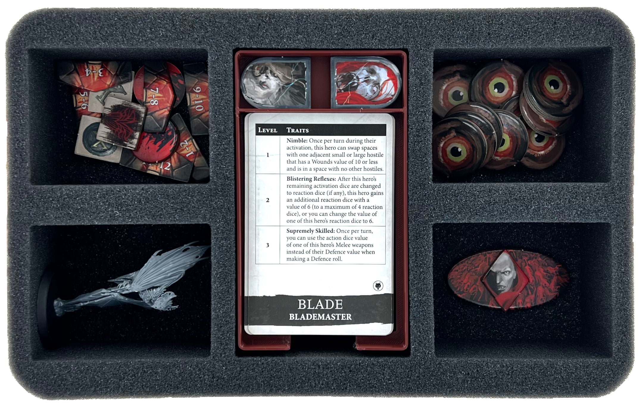 - Neben dem Kartenfach zum Aufbewahren der Spielkarten verfügt der Einsatz über ein Tokenfach und eine Auflage, um die größeren „Elite class trait cards“ unterzubringen.