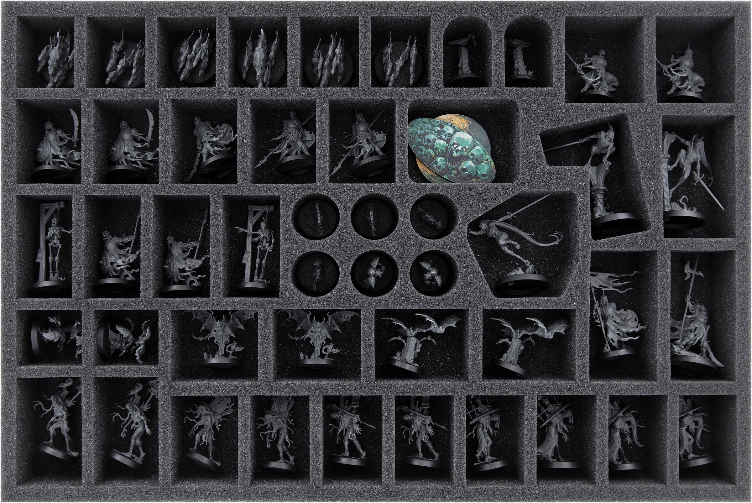Egal ob Vargskyr, Direbat oder Grabstein – auf den beiden Feldherr Schaumstoffeinlagen ist für jede Miniatur ein eigenes Fach reserviert. Vom furchteinflößenden Brutogg Corpse-Eater über die Deadwalker Zombies bis zu den Blood Rats, bekommen alle Helden-, Feindes- und Objektmodelle ein individuell maßgeschneidertes Fach.