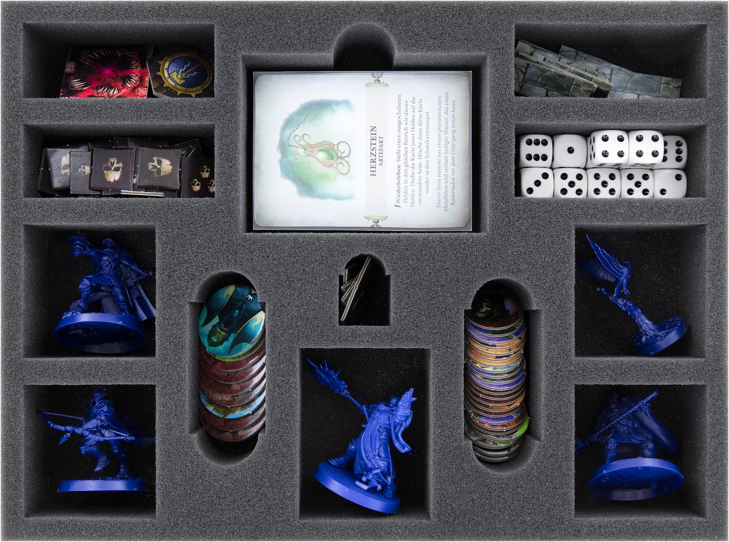 Der passende Schaumstoffdeckel schließt die Rundumversorgung ab. Die doppelseitigen Feind- und Heldenkarten, Spielfelder, und das Booklet werden auf dem Schaumstoffdeckel abgelegt und alles ist übersichtlich und sicher verstaut.