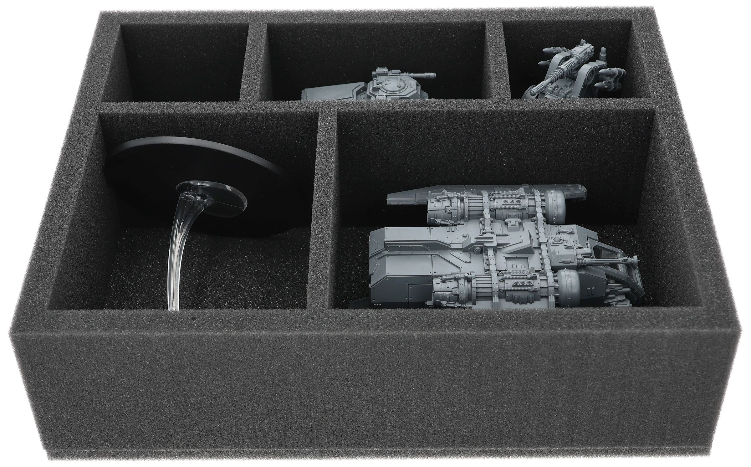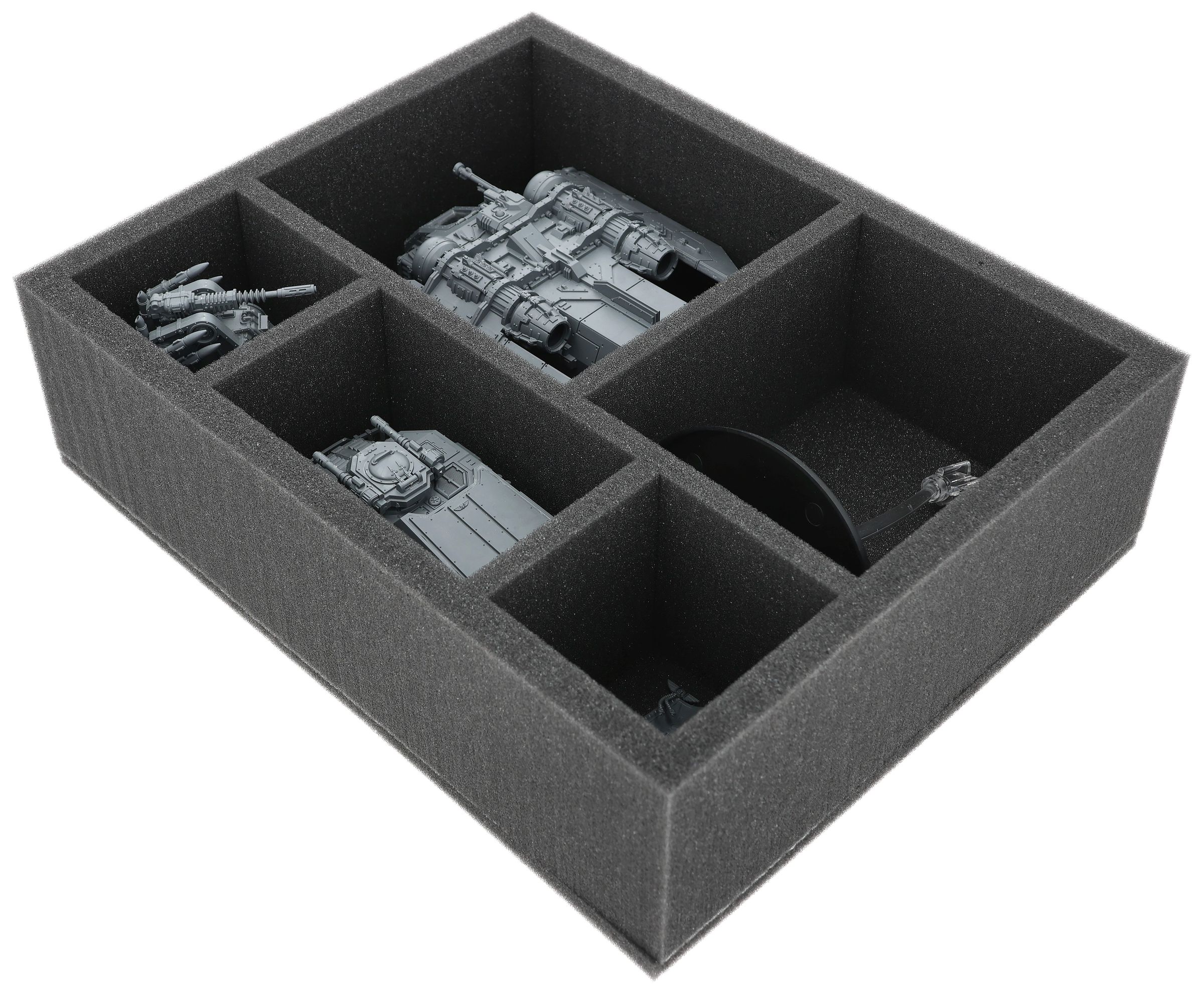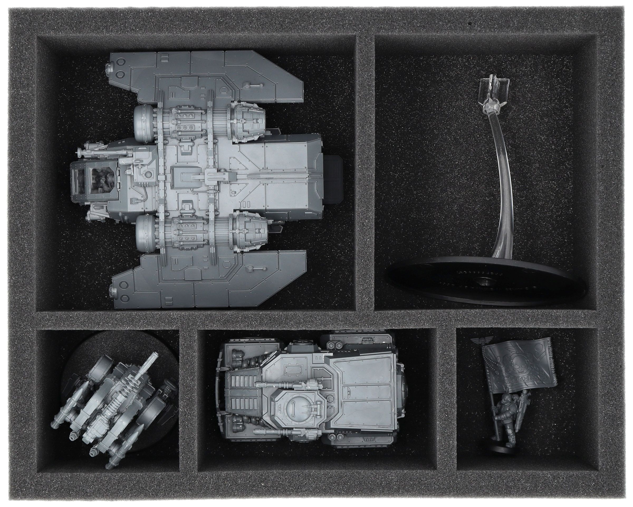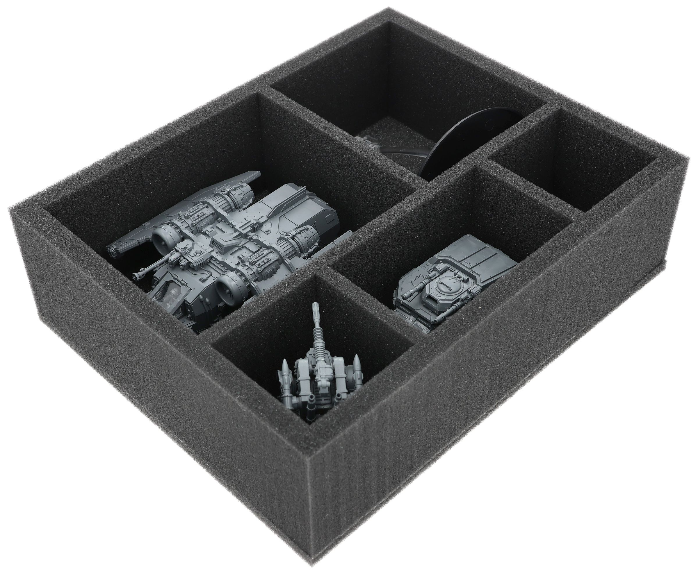 Auf dieser Feldherr Schaumstoffeinlage hast du Platz für bis zu 5 Miniaturen deiner Solar Auxilia. Das Insert eignet sich zum Beispiel besonders gut zum Aufbewahren der Arvus Lighter und Modellen mit ähnlichen Abmessungen.