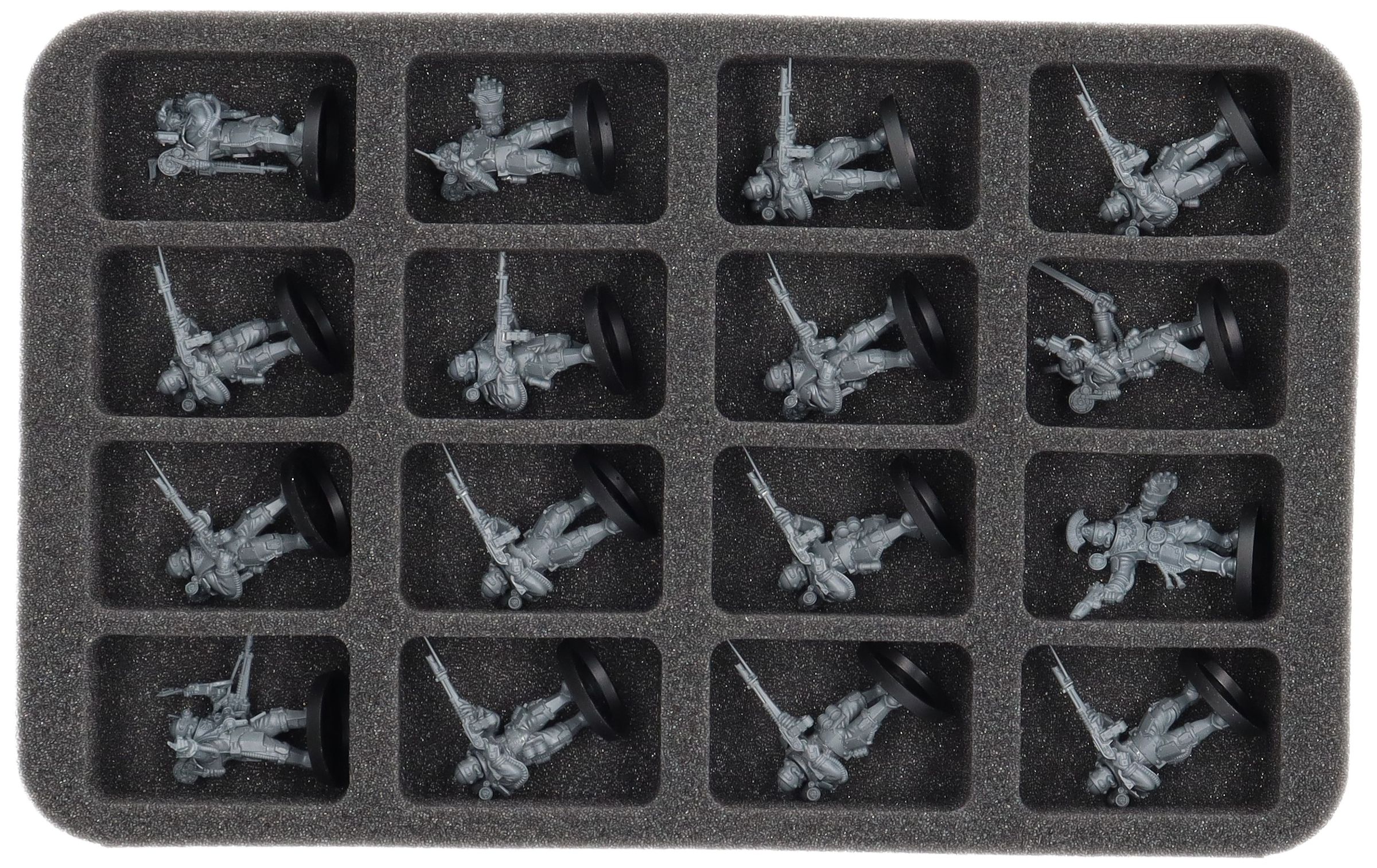 Auf dieser Feldherr Schaumstoffeinlage hast du Platz für bis zu 16 Miniaturen deiner Armee. Das Insert eignet sich zum Beispiel besonders gut zum Aufbewahren der Modelle einer Auxilia-Solar-Schützengruppe mit Lasergewehren oder von Miniaturen mit ähnlichen Abmessungen.