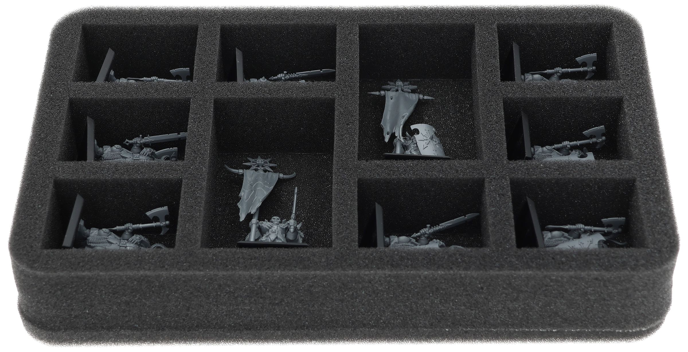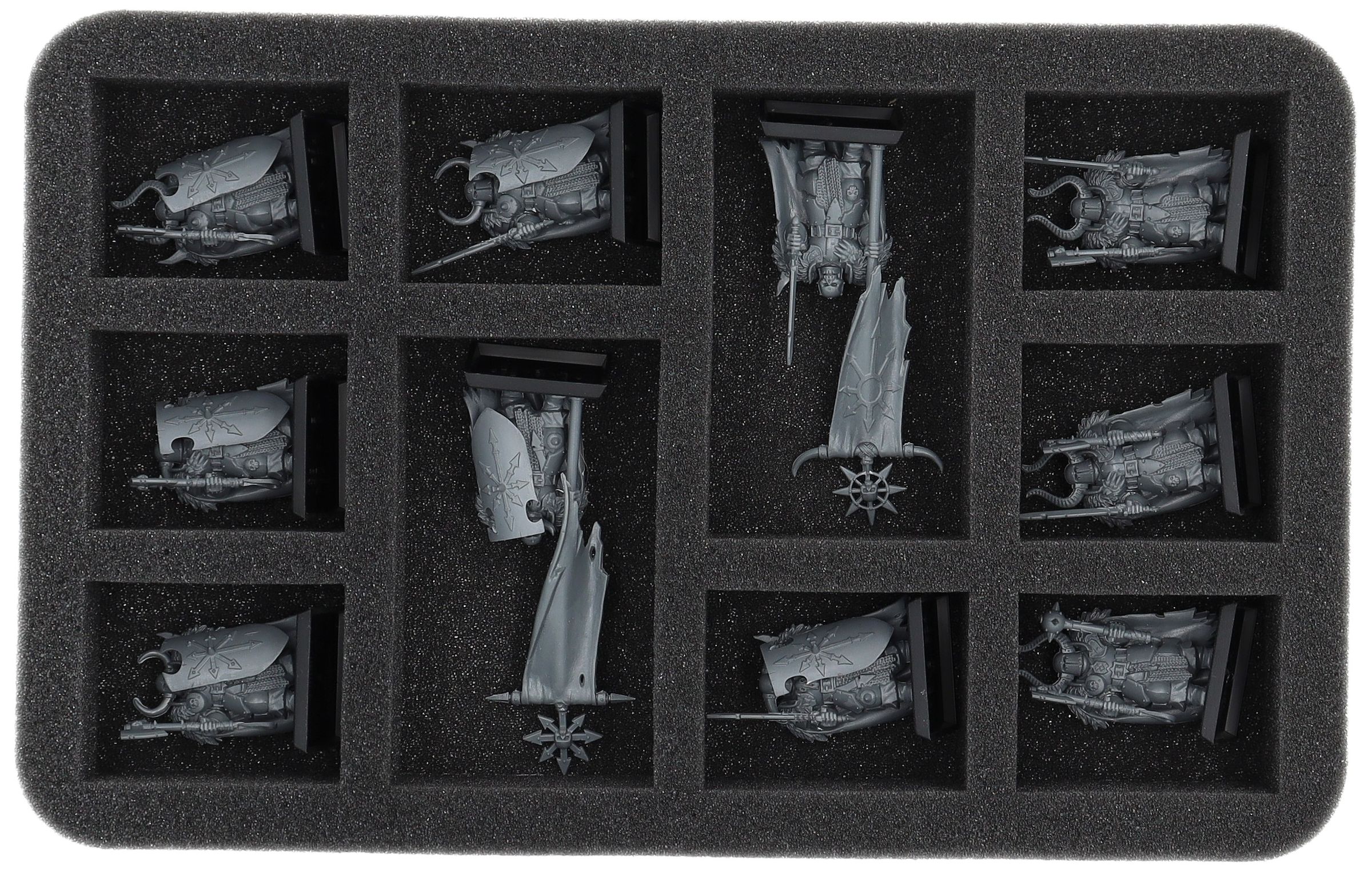 Auf dieser Feldherr Schaumstoffeinlage hast du Platz für bis zu 10 Miniaturen deiner Armee. Das Insert eignet sich zum Beispiel besonders gut zum Aufbewahren der Chaosbarbaren, Chaoskrieger und Modellen mit ähnlichen Abmessungen.