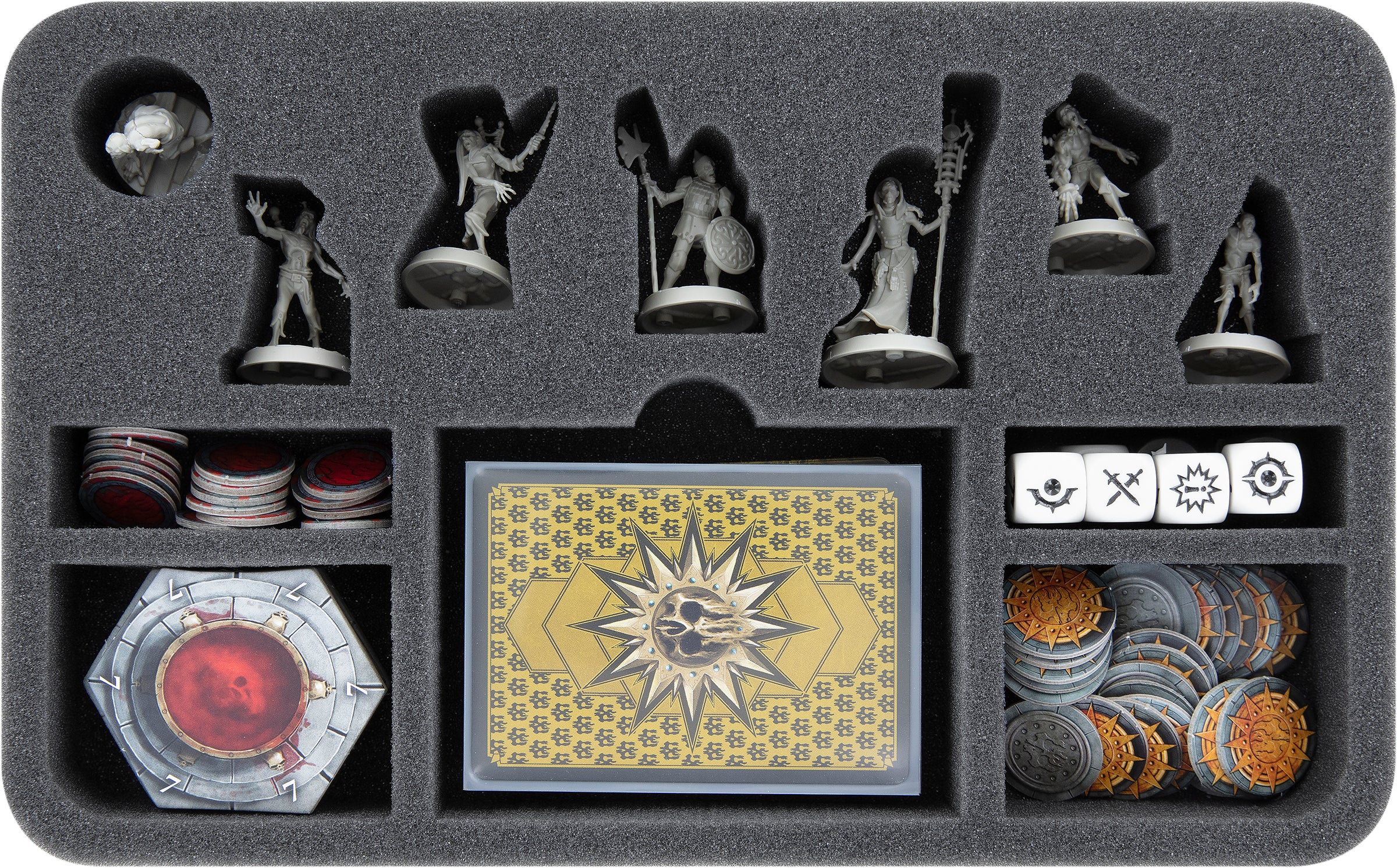 Die 7 Modelle der „Verbannten Toten“ bekommen hier miniaturengenau geschnittene Fächer zugeteilt. Eingebettet in weichen Schaumstoff, sind die Modelle bestens für den Transport zum Spieltisch vorbereitet. Feingliedrige Ausrüstungsgegenstände, wie Stäbe und Hellebarden, sind genauso gut geschützt wie all die anderen empfindlichen Details vor Schäden.
