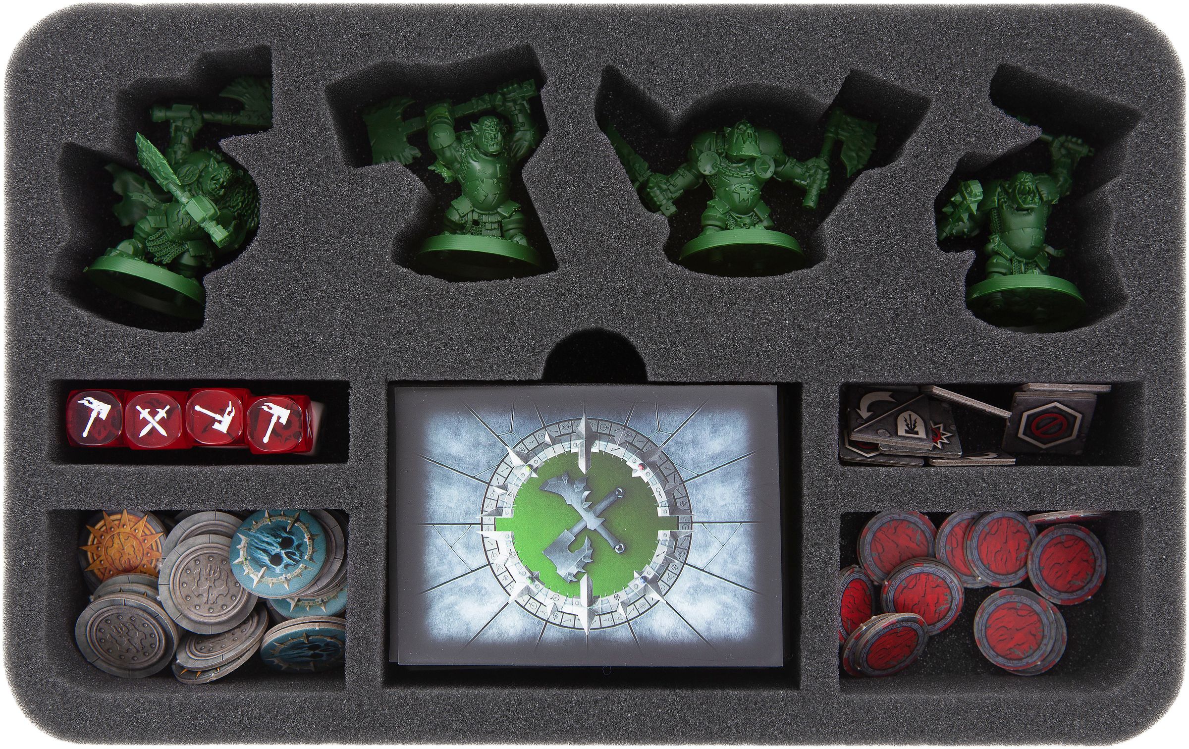 In der Box finden sechs Einlagen Platz, die individuell auf jede einzelne Schar zugeschnitten sind. Dadurch ist garantiert, dass die Miniaturen nicht aneinanderstoßen und die Farben bemalter Figuren möglicherweise abplatzen. Neben maßgeschneiderten Fächern für die einzelnen Spielfiguren, verfügen die Schaumstoffeinlagen über Fächer zum Einsortieren der jeweiligen Karten (auch gesleeved) und Würfel. So sind die Kriegerscharen jederzeit kampfbereit.