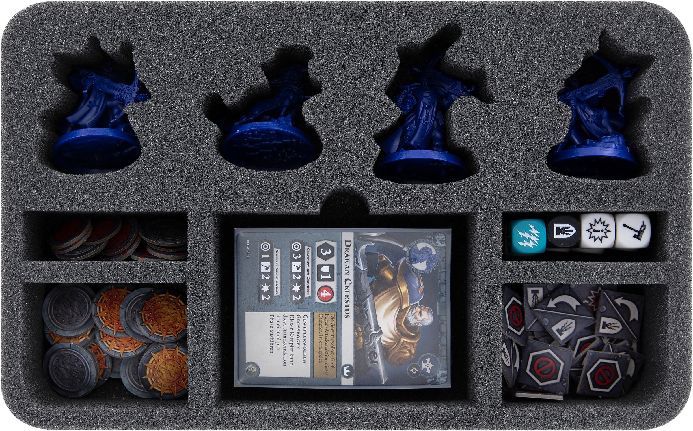 Die maßgeschneiderte Half-Size Schaumstoffeinlage bietet insgesamt 9 Fächer, zum Verstauen der Stormcast Eternals Miniaturen und dem dazugehörigen Spielmaterial aus dem Starterset. Miniaturengenau zugeschnittene Fächer bieten Drakan Celestus, Aphus dem Kühnen, Mellisan Sternenblick und Flink dem Gryph-Hound einen sicheren Rückzugsort.